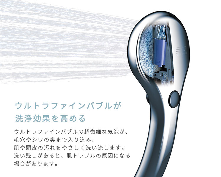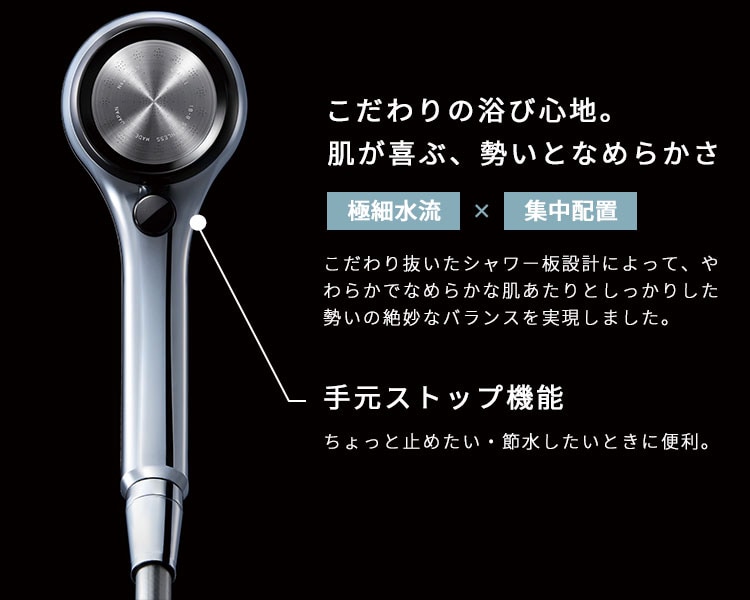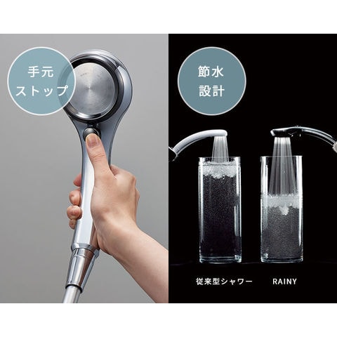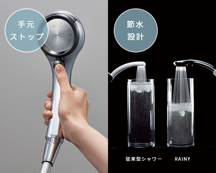 | RAINYシリーズからウルトラファインバブル+一時ストップ登場。浴び心地にもこだわりました。 |