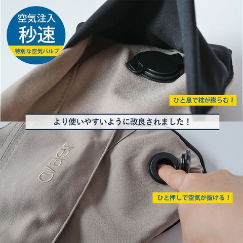 特別な空気バルブにより、ひと息で枕が膨らみ、ひと押しで空気が抜けます。 ふ~ふ~と何度も息を吹き込んだり、ギュ~と枕を押しつぶしながら空気を抜く必要がありません。 使うときも片付けるときもラクチンです。 |