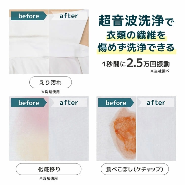 えり汚れ・化粧移り(チーク、ファンデーション)・食べこぼし(ケチャップ・カレー・ソース等)・油汚れ等の嫌な汚れも超音波洗浄で衣類の繊維を傷めず洗浄でき、デリケートな衣類も自分でシミ取り。