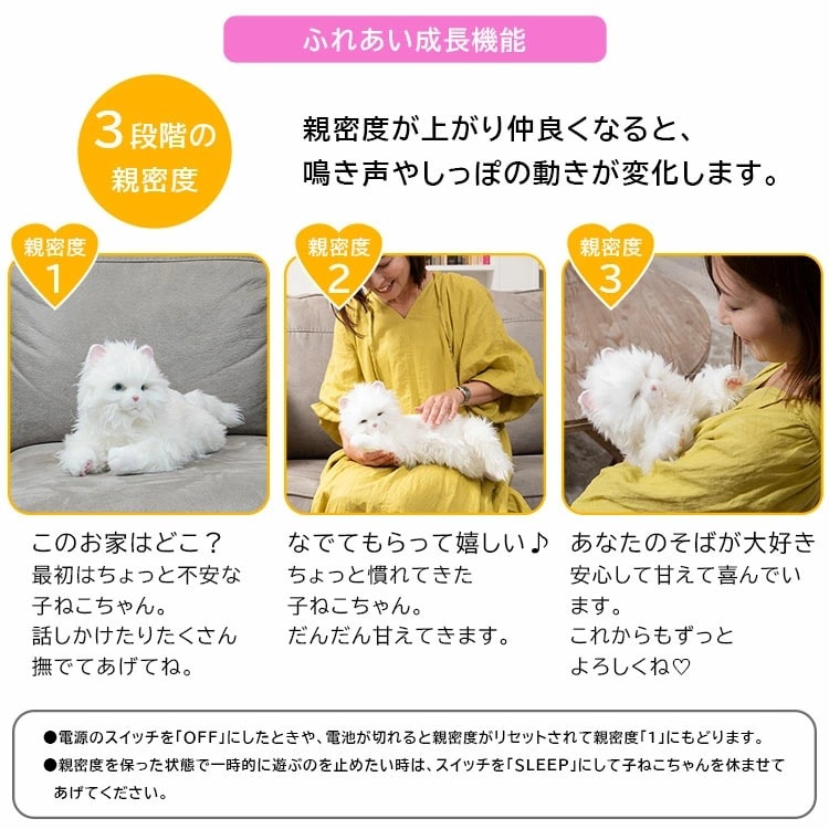【なでなで機能】【あなたの声に反応】 喉や背中を撫でたり呼びかけたりすると様々な反応をします。 【ふれあい成長機能】 たくさん触れ合うと親密度があがり鳴き声やしっぽの動きが変化します。 【スリープ機能】【時間ごとの反応】 2種類のスリープ機能、時間ごとに起きてあなたに呼びかける自動スリープ機能も搭載。 【周囲の音に反応】 テレビの音などの周囲の音に反応します。 |