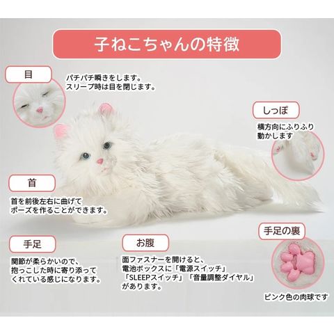 【各種センサー】 子ねこちゃんののどや背中を撫でたり、呼びかけたりするとセンサーが反応します。 センサーが反応すると、鳴いたり、しっぽを動かしたり、目を瞬きしたり様々なアクションをします。 【子ねこちゃんの特徴】 目…パチパチ瞬きをします。スリープ時は目を閉じます。 首…首を前後左右に曲げてポーズを作ることができます。 手足…関節が柔らかいので、抱っこした時に寄り添ってくれている感じになります。 お腹…面ファスナーを開けると、電池ボックスに「電源スイッチ」「SLEEPスイッチ」「音量調整ダイヤル」があります。 手足の裏…ピンク色の肉球です。 しっぽ…横方向にふりふり動かします。 |