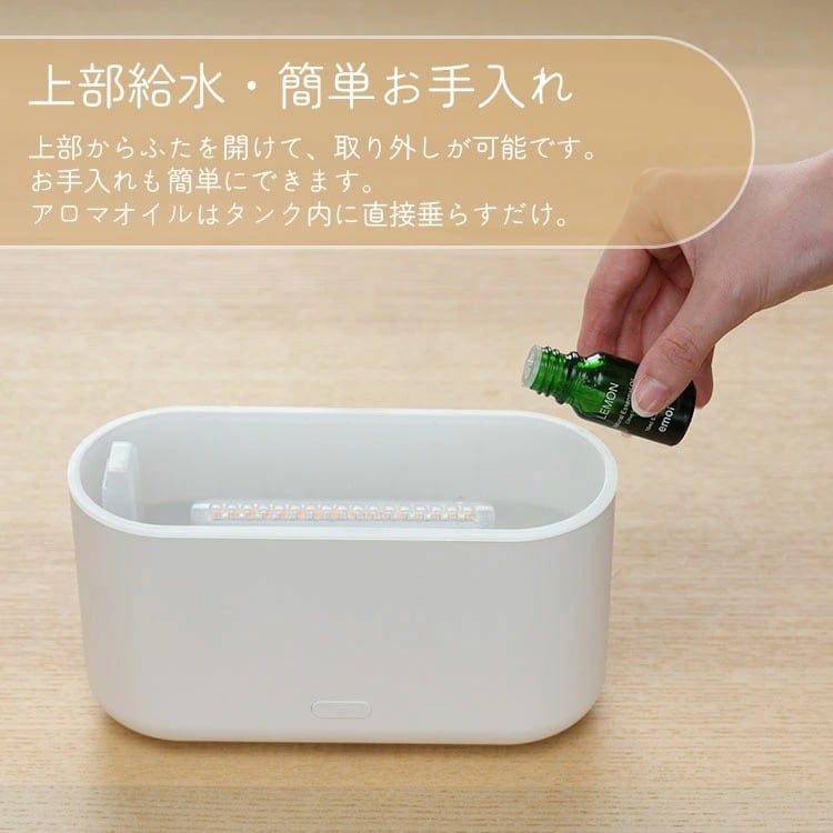 ●ふたをあけて、アロマオイルを垂らすだけ 上部からふたを開けて、取り外しが可能です。アロマオイルはタンク内に直接垂らすだけ。お手入れも簡単にできます。 ●コンパクトなボディ コンパクトなサイズながら、約20ml/hの噴霧量を実現。会社のデスクでの使用もおすすめです◎ ※噴霧量は使用環境(温度・湿度)や、使用中の水位により異なります。 ●炎のようなライトの演出、色の変更も可能! 暖炉のそばにいるような雰囲気。青い炎でいやしの空間を演出。 ●インテリアに馴染むデザイン 乾燥が気になる時期に、パーソナルスペースを快適な湿度に保ちます。 インテリアに馴染むデザインなので、どの場所でも使いやすい! ●USB電源 DC5V(USB電源)になります。USBケーブル付属 |