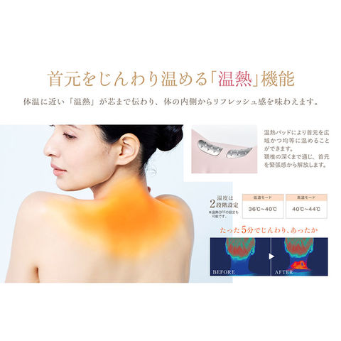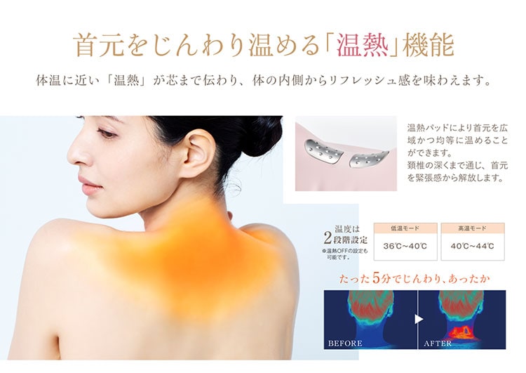 | 凝り固まった緊張をやわらげる上で、首元を深くから温めるのは、とても重要なプロセス。「Neck Revive(ネックリバイブ)」は、体温に近い「温熱」がじわじわと頚椎の深部に伝わり、首から肩にかけての広い範囲へと広がっていきます。2段階の温熱(高温42±3℃ と 低温設定38±3℃)設定をお好みで選べます。 |