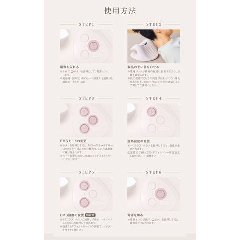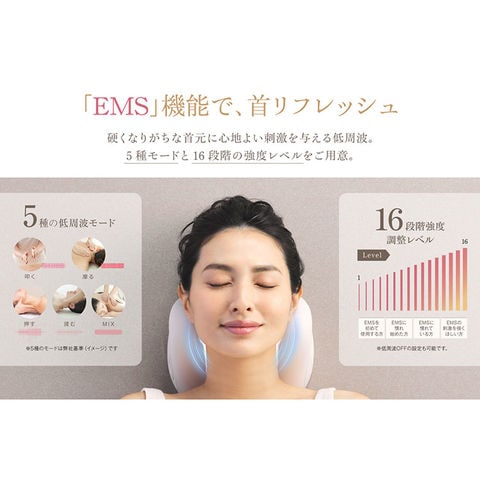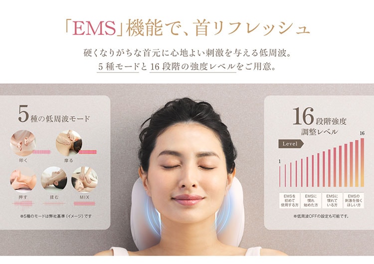 | 独自に開発されたEMSで首元に直接アプローチし、 リフレッシュ 感を。ミックス →叩き→さすり→はりきゅう→揉み の5種モード+16段階レベルで、さまざまな低周波リズムと強度を自分好みにカスタマイズできます。 |