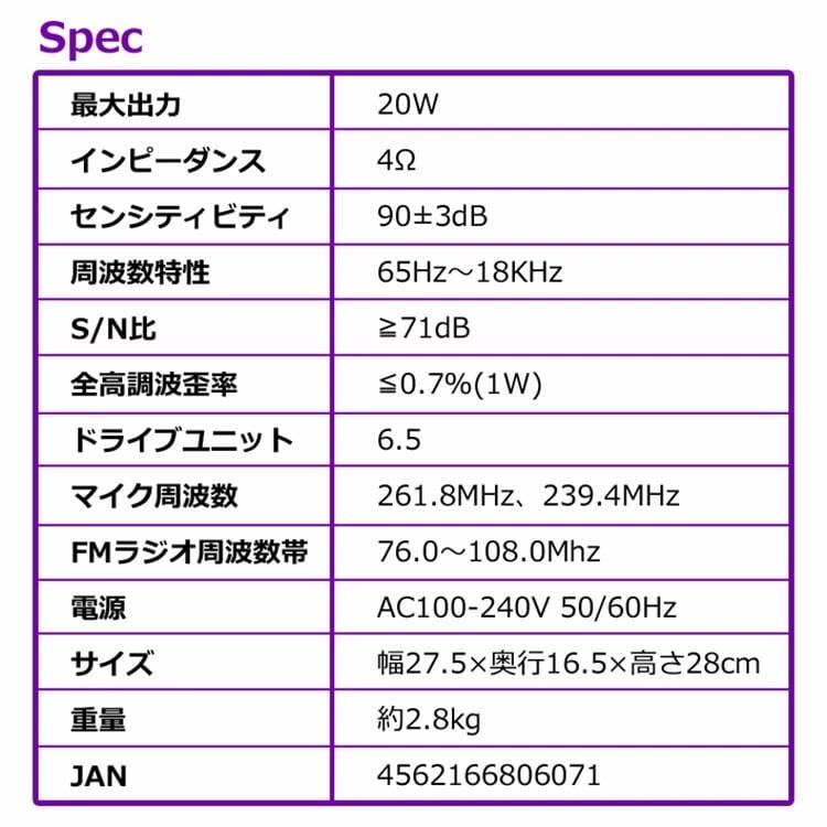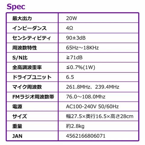 | 仕様 | ■最大出力:20W ■インピーダンス:4Ω ■センシティビティ:90±3dB ■周波数特性:65Hz?18KHz ■S/N比:≧71dB ■前高調波歪率:≦0.7(1W) ■ドライブユニット:6.5 ■マイク周波数:261.8MHz、239.4MHz ■FMラジオ周波数帯:76.0?108.0MHz ■電源:AC100-240V 50/60Hz ■バッテリー容量:1800mAh ■付属品 ワイヤレスマイク×2(電池別売:各単3×2) マイクスタンド×2 リモコン×1(電池別売:CR2025×1) ACアダプター×1 ショルダーベルト×1 AUXケーブル×1 取扱説明書(保証書付)×1 |