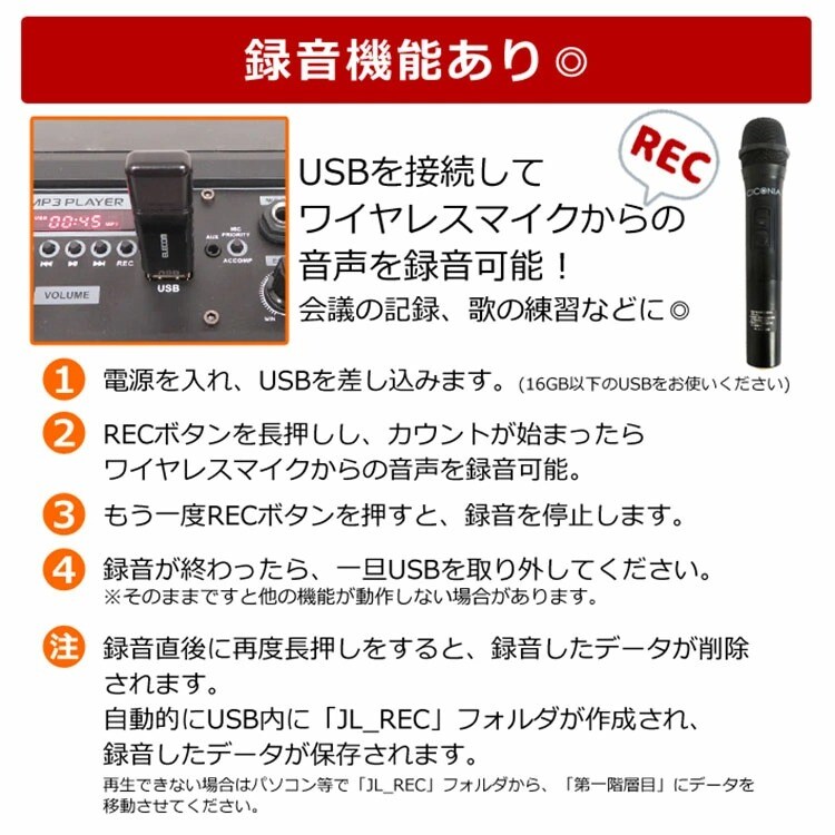 ※同じ周波数のワイヤレスマイク2本での同時使用はできません。 付属のワイヤレスマイク(周波数261.8MHz)×1本、付属のワイヤレスマイク(周波数239.4MHz)×1本、有線マイク(別売り)×1本での同時使用は可能です。 ※充電が空の状態の場合は、電源をお切りになってから充電してください。 ※防水ではありません。 ※マイクと本体を近づけるとハウリングしますので1m以上離してご使用ください。 マイク同士は隣りで使用しても問題はありません。 ※充電時間約5時間で連続使用時間は約3時間となります。 ※商品の色はモニターの具合で実物と若干異なる場合がございます。予めご了承下さい。 ※ご予約・お取り寄せ商品は、ご注文受付後にお客様ご注文分としてメーカーへ発注を致します為、基本的にキャンセルやご返品はお受けできません。 ※デザイン、仕様等につきましては、予告なく変更する場合がございます。予めご了承下さい。 ※複数店舗を運営しておりますため、ご注文の入れ違い等で欠品などになってしまう場合がございます。万が一、発送が遅れる場合は、ご注文受付当日中にご案内差し上げます。誠に恐れ入りますがご了承くださいますよう、お願い申し上げます。 |