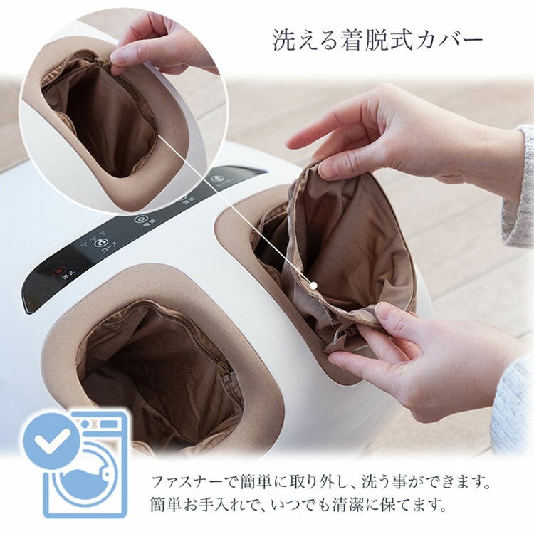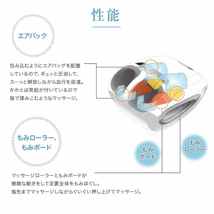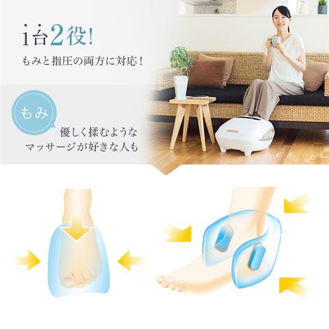 ●エアバッグ 包み込むようにエアバッグを配置しているので、ギュッと圧迫して、スーッと解放しながら血行を促進。かかとは突起がついているので指でもみこむようなマッサージ。かかと周辺を左右エアバッグで挟みもみ。 ●もみローラー、もみボード マッサージローラーともみボードが複雑な動きをして足裏全体をもみほぐし。指先までマッサージしながらぐいぐい押し上げてマッサージ。 ●1台2役! もみと指圧の両方に対応。 【もみ】優しくもむようなマッサージが好きな人も。 【指圧】足裏をゴロゴロ、いた気持ちよくマッサージしたい人も。 ●家計にやさしい省エネ仕様 1回の電気代は約0.3円 ※1KW=27円で計算 一般的な足つぼマッサージ2.5時間分の費用で、毎日使い放題 1年間使っても1日あたり42円! ●自分好みのコースと強さが選べます エアーの強さは、弱・中・強の3段階調整可能。 ●洗える着脱式カバー ファスナーで簡単に取り外し、洗うことができます。 簡単お手入れで、いつでも清潔に保てます。 ●ヒーター機能付き ヒーターとマッサージのW(ダブル)効果で、 足裏じんわり、ぽかぽか。 ●足裏パッド付 強めのマッサージが苦手な方に。 |