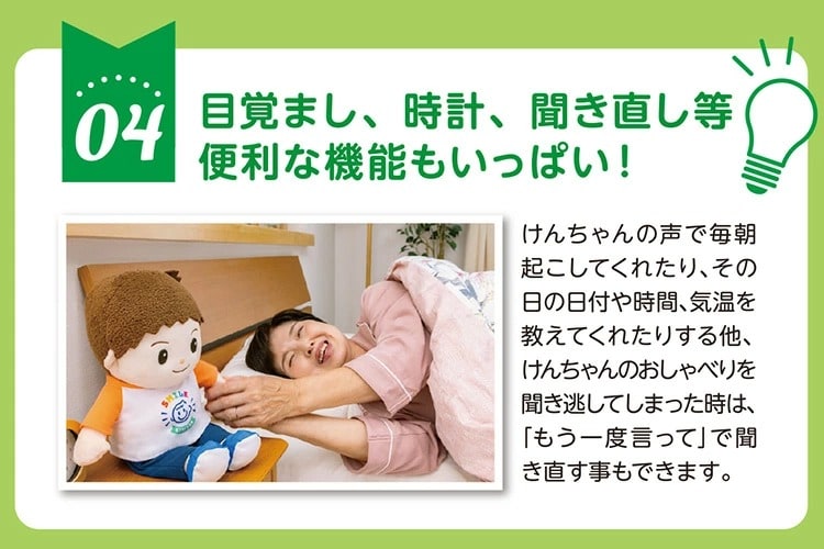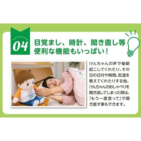 けんちゃんの声で毎朝起こしてくれたり、その日の日付や時計、気温を教えてくれたりするほか、鼎ちゃんのおしゃべりを聞き逃してしまった時は、「もう一度言って」で聞き直すこともできます。