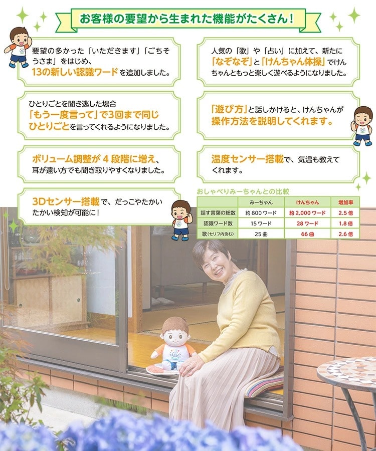 ■keyword:スマイル/けんちゃん/おしゃべりけんちゃん/おしゃべりみーちゃん/おしゃべり/会話/話し相手/ぬいぐるみ/人形/男の子/男子/音声認識/音声認識人形/介護用品/介護/お年寄/高齢者/留守番/ワード/挨拶/あいさつ/なぞなぞ/歌/遊び/センサー/友達/人工知能型ロボット/しゃべるぬいぐるみ/自宅/実家/老人ホーム/介護施設/高齢者施設/目覚まし/プレゼント/贈り物/誕生日/バースデー/お祝い/父の日/母の日/敬老の日/一軒家/戸建て/アパート/マンション/一人暮らし/かわいい/かっこいい/おしゃれ/新聞/日経MJ/トレンド/メディア出演
