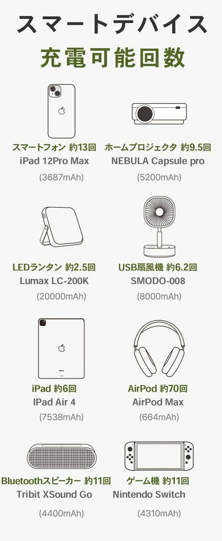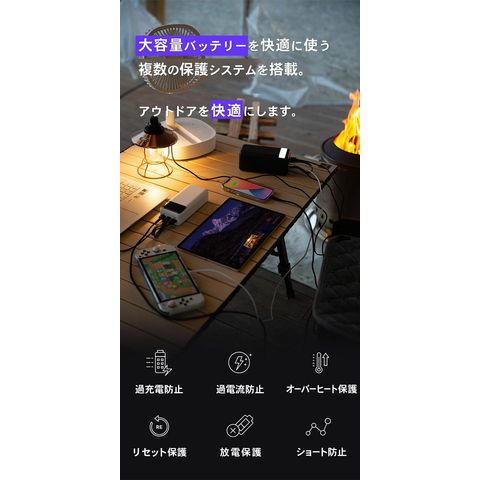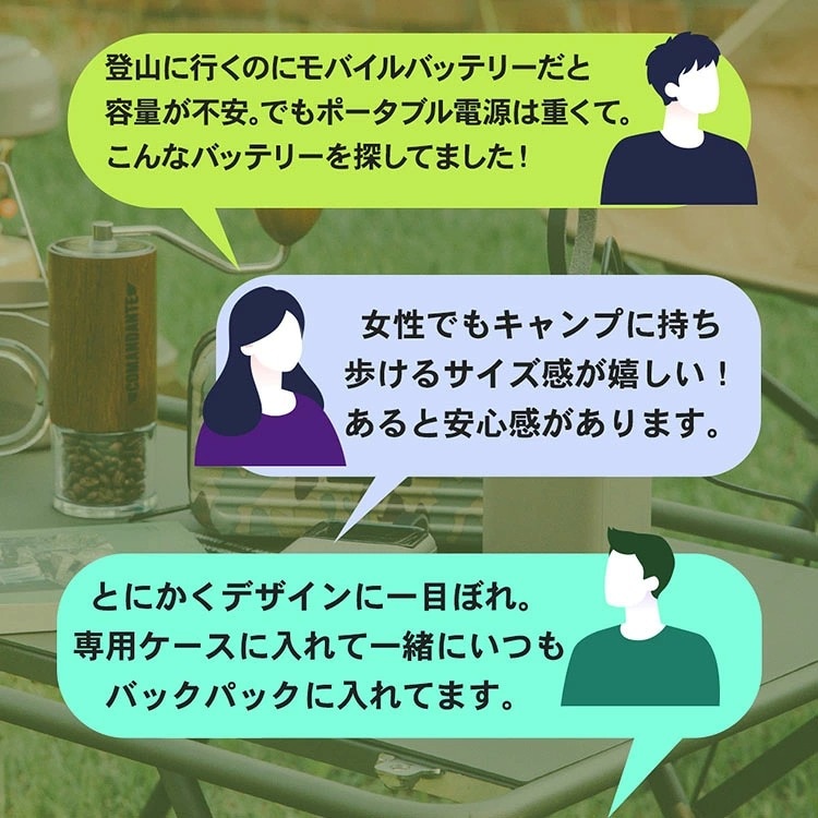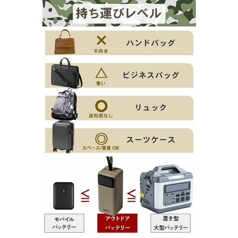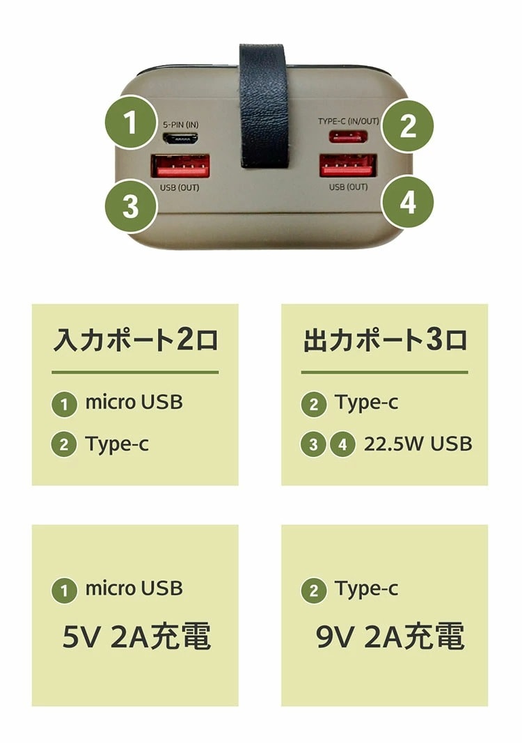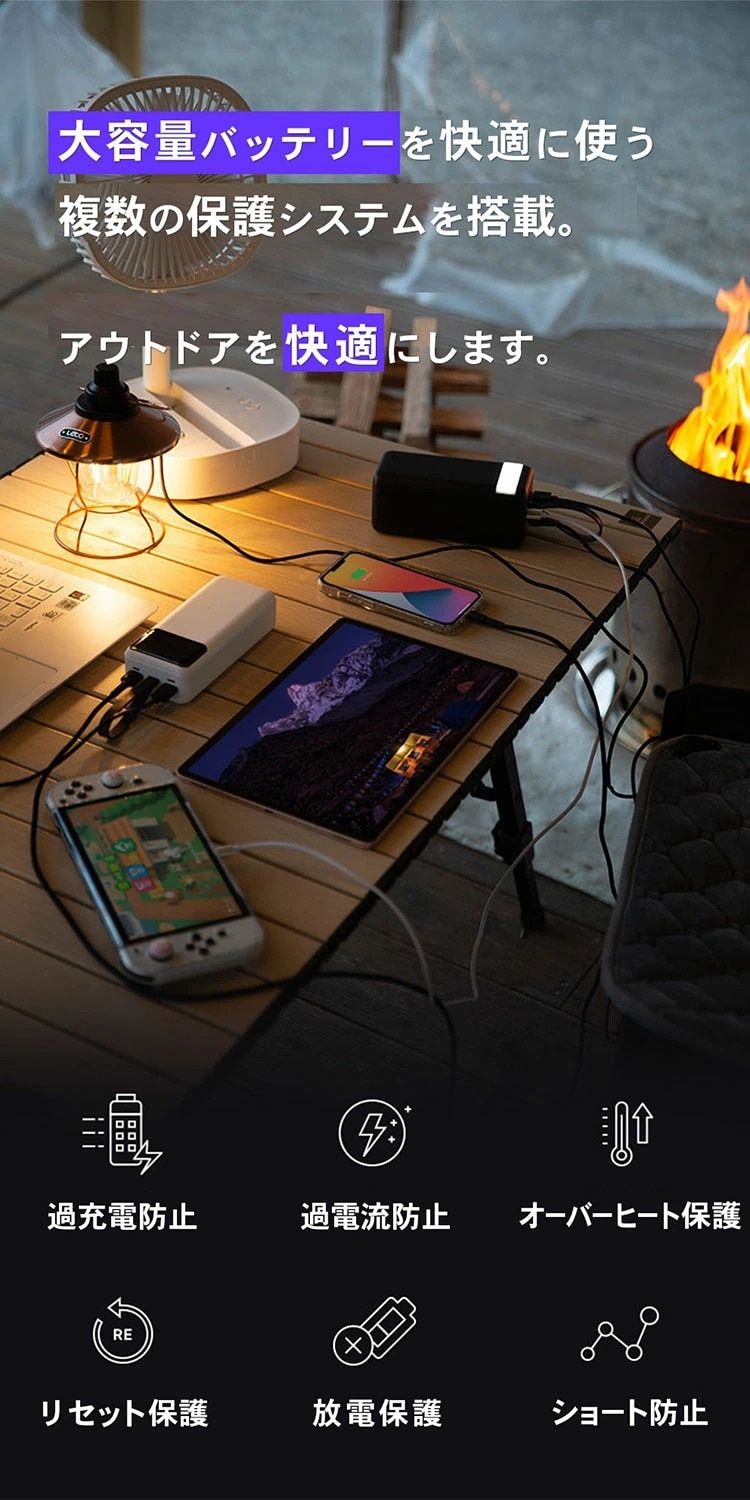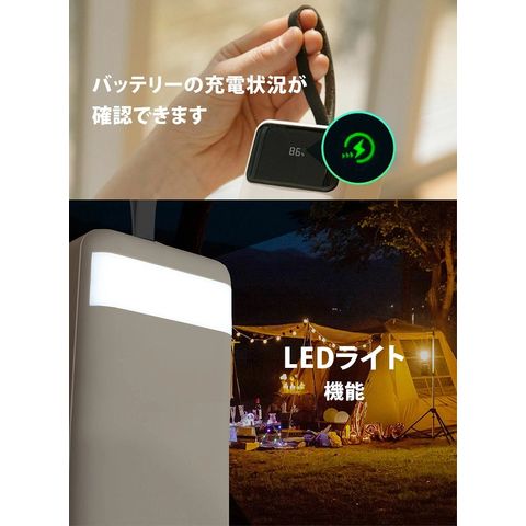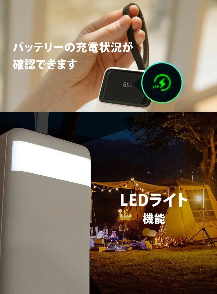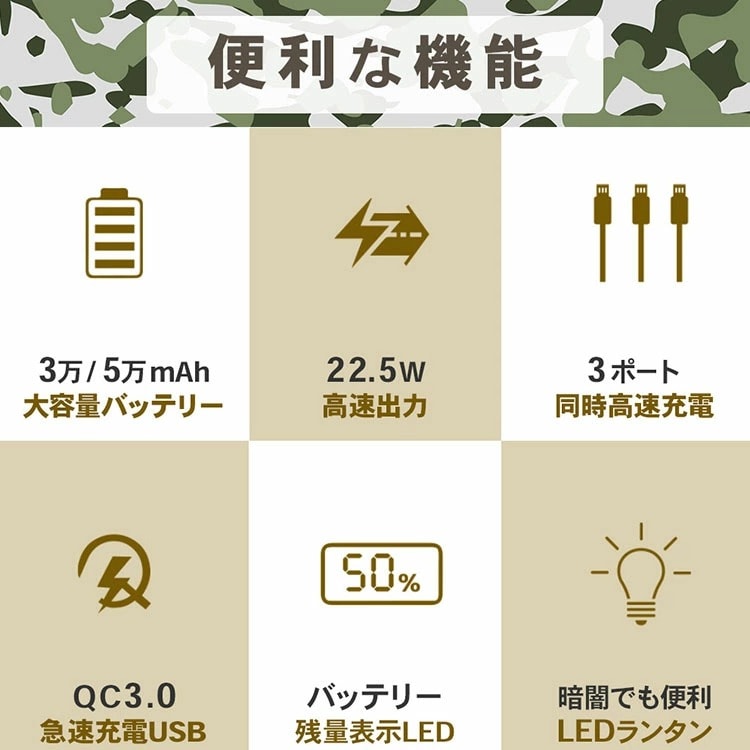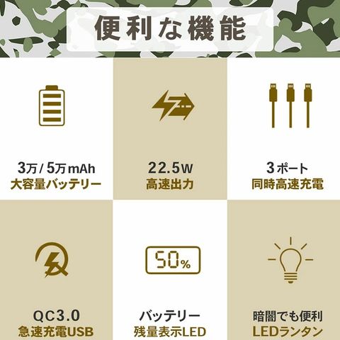 ●USB充電に特化したアウトドア用バッテリー ●長期の停電に対応する災害用バッテリー ●持ち運び可能で重量のさほど気にならない丁度いいサイズ感 ・3万mAh大容量バッテリー ・22.5W高速出力 ・3ポート同時高速充電 ・QC3.0急速充電USB ・バッテリー残量表示LED ・暗闇でも便利なLEDランタン |