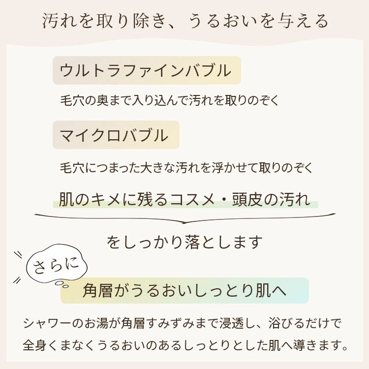 【ReFa FINE BUBBLEシリーズの特徴】 1.ファインバブル技術 全シリーズで、「 ウルトラファインバブル 」 と 「 マイクロバブル 」を発生させる独自技術を採用。 微細な泡が肌や頭皮の毛穴の奥まで入り込んで、皮脂や汚れを吸着して取り除きます。 2.簡単な取り付け 2種のアダプター付きで、工具や専門知識は不要。 ご家庭で既存のシャワーヘッドと取り替えるだけで、届いたその日から使用可能です。 3.モード切替機能 部位ごとの肌や洗浄の目的に合わせて水流モードを切り替えて、調整することができます。 ※シリーズによってモード数が異なります。 4.節水 水の使用量を削減しながら、効果的な洗浄を実現。環境にも家計にもやさしいシャワーヘッドです。 【ReFa FINE BUBBLEシリーズの使用効果】 1.スキンケア・頭皮ケア 毎日のシャワーでしっかり汚れを取り除くことで、透明感がある美肌につながります。 2.うるおい シャワーの水が角層まで浸透し、うるおいを与えしっとりとした美肌へと導きます。 3.あたため シャワーヘッドを浴槽に入れると、なめらかな肌ざわりのシルキーバスになります。 肌をやわらかく包み込み体をあたため、バスタイムをリフレッシュのひとときに。 4.ペットのにおいケア 愛犬や愛猫など大切なペットのベタツキを浮かせて落とし、豊かな毛並みへと導きます。 洗浄力の高さや使用感の良さをご実感いただいています。 |