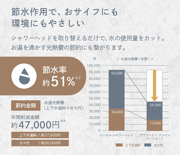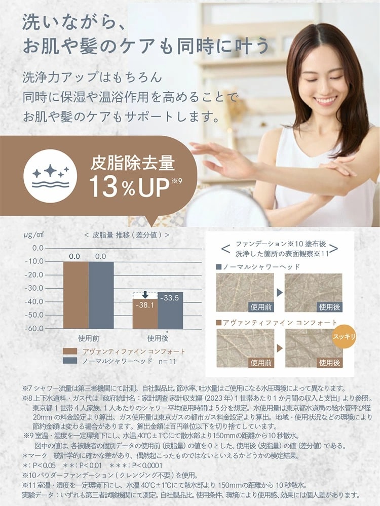 ライフスタイル&ビューティケアのバランス型。皮脂除去量 約13%UP及び保湿作用に加え、差し湯によるファインバブル温浴をすることで湯冷めしにくくなり、快適なお風呂上がりをサポートします。 最大節水率は約51%で、年間約47,000円の節約効果が期待できます。 さらに、別売りのカートリッジを使用すれば浄水機能も追加可能です。 【節水と洗浄・保湿・温浴作用のバランスが良いファインバブルシャワー】 ・節水率約51%。水道光熱費(上下水道料+ガス代)年間約47,000円削減! ・洗浄:皮脂除去量13%UP、保湿:肌水分量に優位差あり、温浴:浸漬時に湯冷めしにくい ・別売の「浄水カートリッジ」使用で浄水機能付きにアップグレード可能。 【こんな方におすすめ】 ・しっかり節水したい方 ・洗浄もビューティケアも両立したい方 ・浄水したい方 |