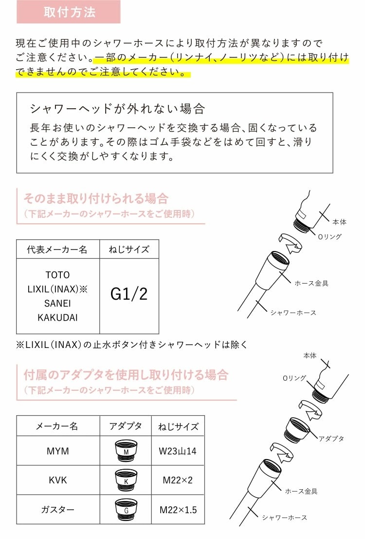 ※水圧が極端に低い場所では、水の勢いが弱くなる場合があります。 ※節水率は設置場所によって効果が出にくい場合があります。 ※現在ご使用のシャワーホースにより取り付け方法が異なります。 ※浄水カートリッジは付属しておりません。 ※商品の色はモニターの具合で実物と若干異なる場合がございます。予めご了承下さい。 ※デザイン、仕様等につきましては、予告なく変更する場合がございます。予めご了承下さい。 ※ご予約・お取り寄せ商品は、ご注文受付後にお客様ご注文分としてメーカーへ発注を致します為、基本的にキャンセルやご返品はお受けできません。 ※複数店舗を運営しておりますため、ご注文の入れ違い等で欠品などになってしまう場合がございます。万が一、発送が遅れる場合は、ご注文受付当日中にご案内差し上げます。誠に恐れ入りますがご了承くださいますよう、お願い申し上げます。 | |