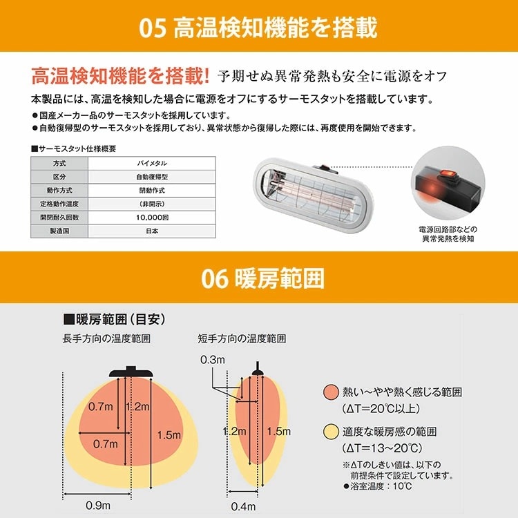 ●冬場のお風呂を暖かく快適に! 既存の浴室に設置できるお風呂ヒーター 温度変化を無くし、ヒートショック現象を防ぎ身体への負担軽減 ●使用中に水・お湯がかかっても大丈夫 公的機関で防水性能の試験を実施し、防水性能IPX5という厳しい規格にパスした製品 ●超速暖 自分が使いたいときにすぐに温まる設計で、1秒で暖かくなります ヒートショックによる身体への負担を軽減できます ●電源スイッチは2か所に搭載 製品本体とプラグ部の2か所に電源スイッチを搭載いています ●高温検知機能を搭載! 本製品には、高温を検知した場合に電源をオフにするサーモスタットを搭載しています ●暖房範囲 |