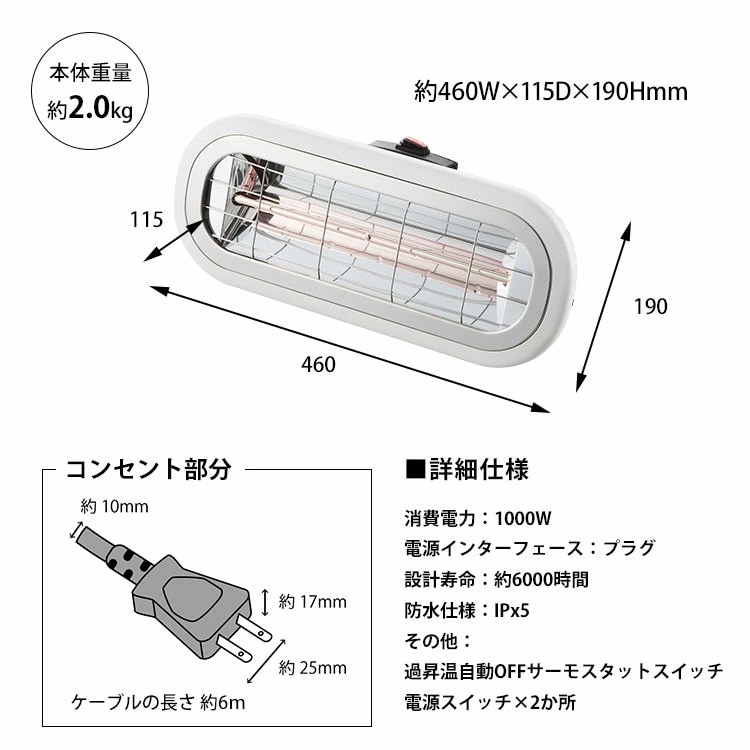 | 仕様 | ■消費電力: 単相100V 50/60Hz、1,000W(強弱切替無し) ■電源プラグ・ケーブル プラグ:アース付き2端子プラグ ケーブル:約6m ■安全機能: 自動復旧型サーモスタット ■設計寿命: 6000時間 ■設置方法: 吊り下げ設置、壁設置 |