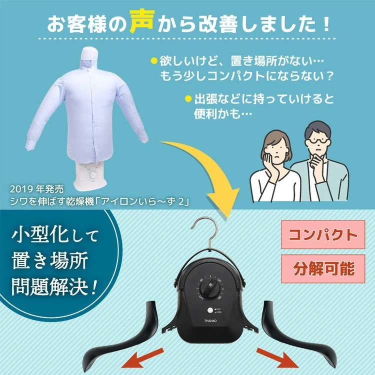 ■keyword:アイロンいら~ず3/サンコー/THANKO/ハンガー型/ハンガー/衣類乾燥機/衣類乾燥/乾燥機/乾燥器/アイロンいらず/アイロン不要/アイロンがけ/シワ伸ばし/皺/シワ/時短/温風/コンパクト/ミニ/小型/軽量/軽い/家事/楽/ラク/衣類/洋服/シャツ/トップス/厚手/厚手の服/洗濯/お洗濯/ニオイ対策/作業着/制服/学生服/サイズ調整/タイマー/冷風/切替/出張/旅行/出先/宿泊先/ホテル/分解可能/小型化/掛ける/簡単/エアバッグ/ハンガーラック/アイデア商品/アイデアグッズ/おしゃれ/シンプル/スマート/マット/一年中/通年/オールシーズン/2024年版/最新モデル/最新版/改良/ホワイト/白/しろ/シロ/white/ブラック/クロ/黒/くろ/black/単色/一軒家/戸建て/マンション/アパート/ギフト/誕生日/バースデー/プレゼント/お祝い/贈り物/新築/新築祝い/結婚祝い/結婚/内祝い/父の日/母の日/敬老の日/引越し祝い/引越/4580060600014/4580060600007//