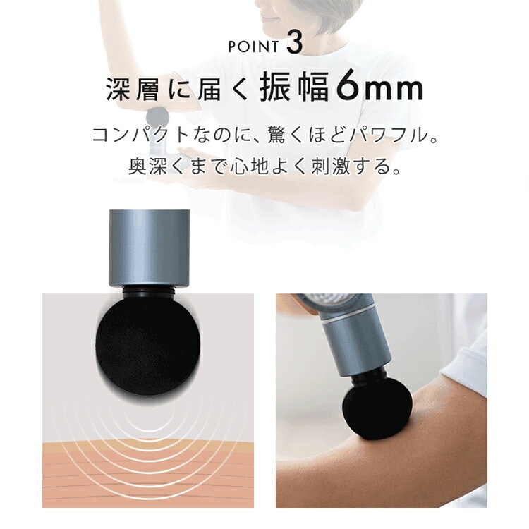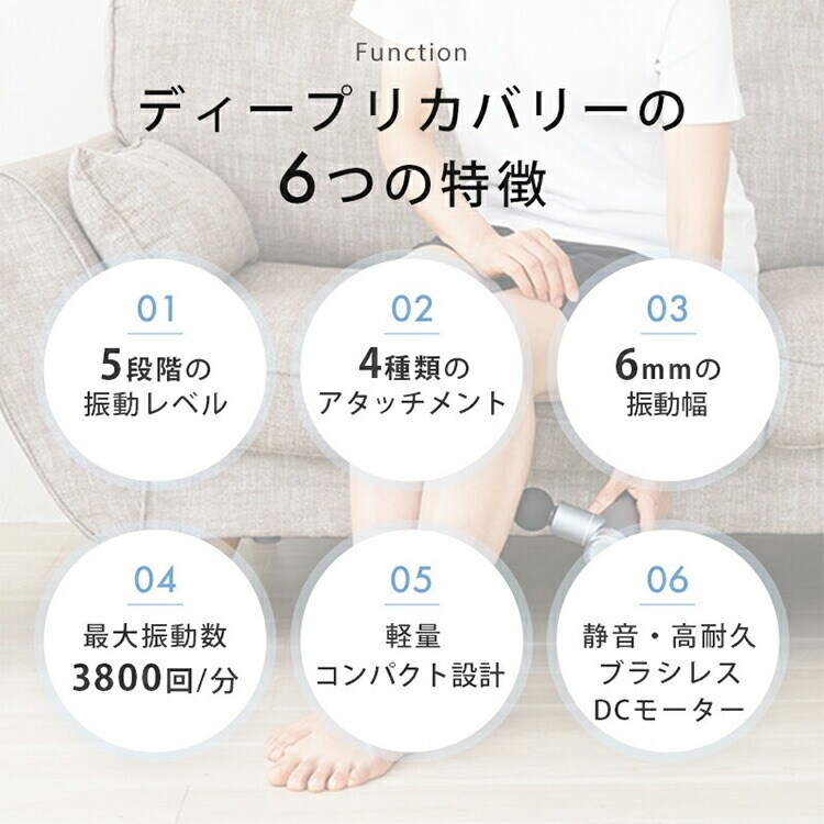 01 5段階の振動レベル 02 4種類のアタッチメント 03 6mmの振動幅 04 最大振動数3800回/分 05 軽量コンパクト設計 06 静音・高耐久ブラシレスDCモーター |