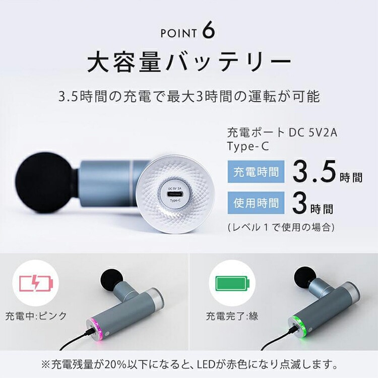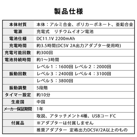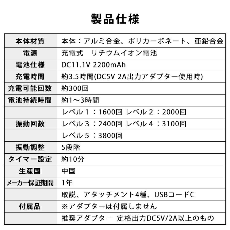 | 仕様 | ●電源:充電式 リチウムイオン電池 ●電池仕様:DC11.1V 2200mAh ●充電時間:約3.5時間(DC5V 2A出力アダプター使用時) ●充電可能回数:約300回 ●電池持続時間:約1?3時間 ●個装箱サイズ:18×20×8cm ●振動回数:レベル1:1600回 レベル2:2000回 レベル3:2400回 レベル4:3100回 レベル5:3800回 ●振動調整:5段階 ●タイマー設定:約10分 ●生産国:中国 |