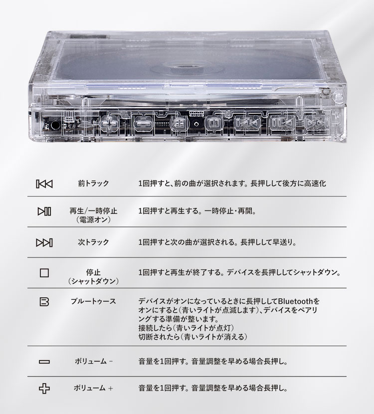 待望のCp1クリアモデルが登場!透明感が高く強度が強いポリカーボネートを使用。 クリスタルの様なスクエアなボックスにブラックのデザインされた基盤が収めらえています。 CDプレーヤー「Cp1」はBluetooth5.1を搭載したポータブルCDプレーヤーです。 リチウムイオンバッテリーを搭載し連続7~8時間の連続再生が可能です。 また、別売の壁掛け金具やスタンドを使う事で歌詞カードを挿入しインテリアアイテムとしてもお使い頂けます。 |