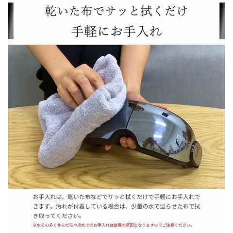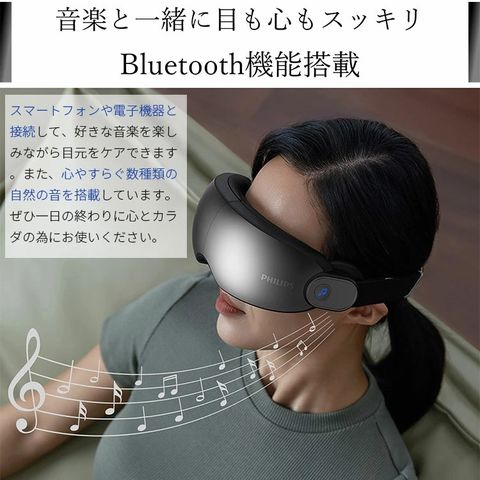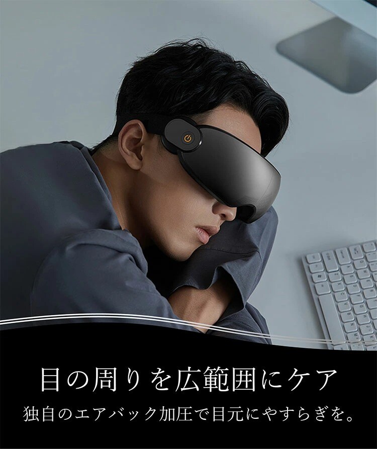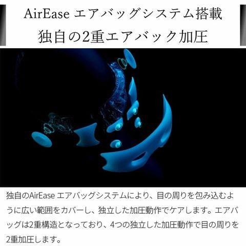 目の周りを包み込む気持ち良いエアバック加圧と、じんわりと温める温感ケアで目も心も癒しの時間へ!覗き窓付きのデザインなのでケアしながら仕事やスマートフォン操作も可能です。目元からこめかみまで広範囲をカバーする上質な目元ケアで癒しの時間をお過ごしください。 ●目元も心も癒しの時間へ。4つのポイント。 1.独自のエアバック加圧 独自のAirEase エアバッグシステムにより、目の周りを包み込むように広い範囲をカバーし、独立した加圧動作でケアします。 エアバッグは2重構造となっており、4つの独立した加圧動作で目の周りを2重加圧します。 エアバッグ加圧は、目を圧迫することなく適切な強度を保ち、酷使した目を徹底ケアします。 2.覗き窓付きのデザイン 覗き窓付きのデザインなので、日常の仕事やスマートフォン操作をしながら酷使した目をケアできます。 目の周りをエアバッグで加圧しながら仕事ができるので、目の負担を抑えながら作業できます。 3.じんわり温感ケア 内蔵の温度プローブにより、表面温度を心地よい約40°Cにコントロールするサーモスタット温度制御を実現しました。 均一にコントロールされた温度で、酷使した目元をじんわり温感ケアできます。 4.Bluetooth機能搭載 Bluetooth機能を搭載しているため、スマートフォンや電子機器と接続して、好きな音楽を楽しみながら目元をケアできます。 また、心やすらぐ数種類の自然の音を搭載しています。ぜひ一日の終わりに心とカラダの為にお使いください。(※自然の音はON/OFF切り替え可能です。) |