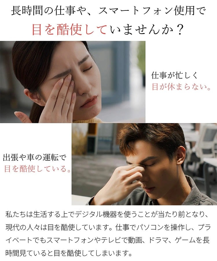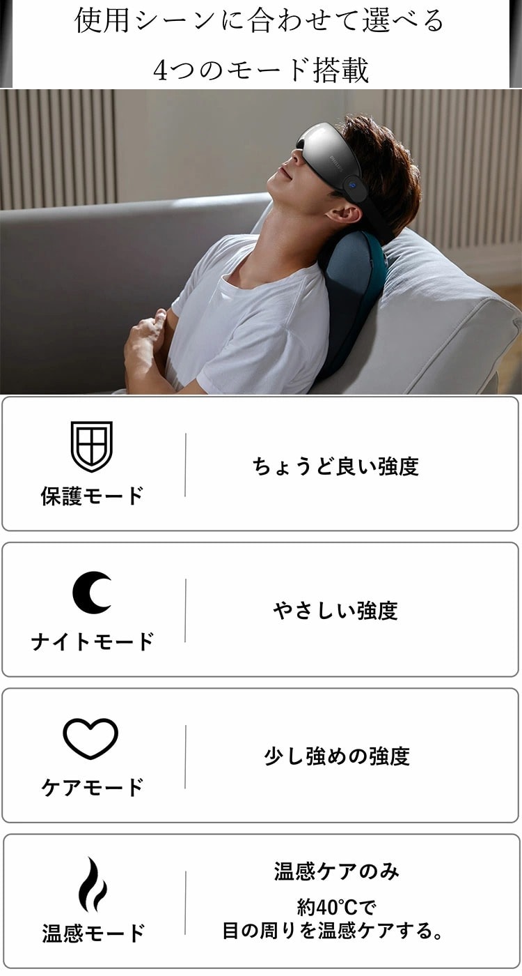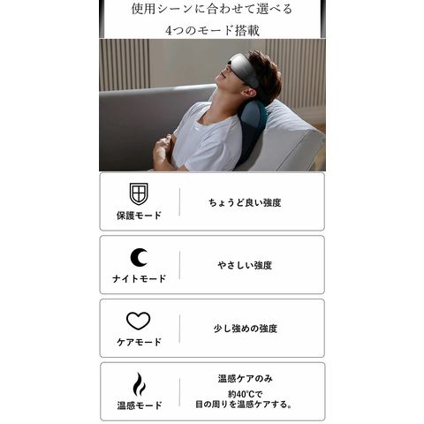 ●使用シーンに合わせて選べる4つのポイント 使用時に適したモードを選択して、いつでもどこでも酷使した目元をケアできます。 保護モード…ちょうど良い強度 ナイトモード…やさしい強度 ケアモード…少し強めの強度 温感モード…温感ケアのみ(約40℃で目の周りを温感ケアする) ●折りたたんでカバンに簡単収納 持ち運びに便利な専用の収納袋を付属しています。折りたためるのでカバンに入れても他の荷物の邪魔にならず、外出先に持ち運んでご使用いただけます。 ●Type-C充電設計 便利なType-C充電設計なのでパソコンや様々な電子機器と互換性があり、あらゆる機器から充電できます。 ●こんな方におススメ ・オフィスワークの方 ・長時間スマートフォンやテレビを見たり、ゲームをする方 ・出張や旅行など外出する機会が多い方 |