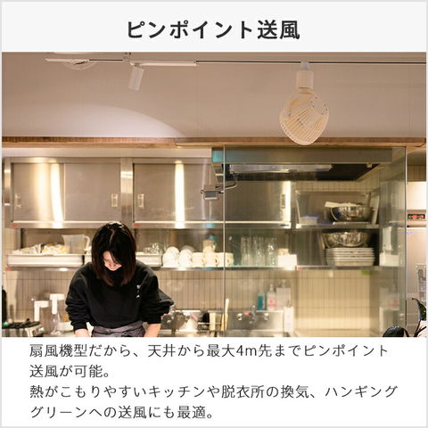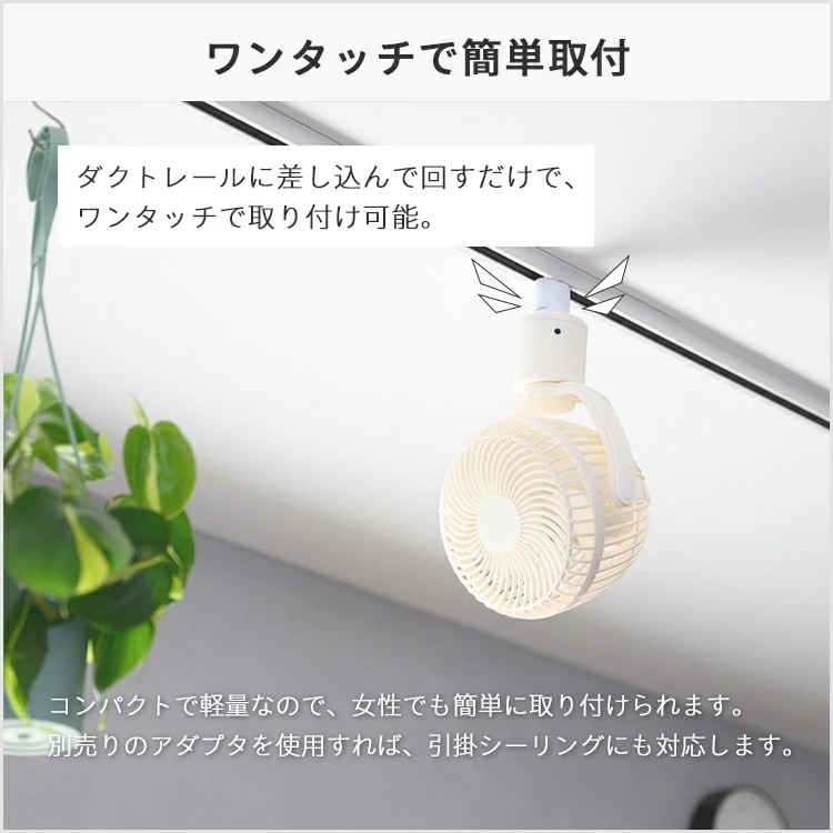 狙った場所へ送風:扇風機型だから、天井のダクトレールから最長4m先まで、必要な場所にピンポイントで風を送れます。 キッチン、脱衣所、ハンギンググリーンなど、用途は様々です。 広範囲に送風&撹拌:付属のリモコンで、120°の自動首振りが可能。お部屋の空気を効率的に循環させ、冷暖房の温度ムラを解消します。風量は6段階で細かく調整でき、お好みの風量で使用できます。 取り付け簡単:ダクトレールにワンタッチで取り付け完了。軽量設計なので、女性でも簡単に設置できます。別売りのアダプタを使えば、引掛シーリングにも対応可能です。 お手入れラクラク:前面カバーは取り外し可能。手が届きにくい裏側も、お手入れ窓から簡単にメンテナンスできます。 |