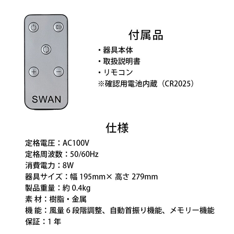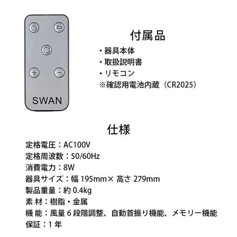 | 仕様 | ■その他仕様: 機 能:風量6段階調整、自動首振り機能、メモリー機能 定格電圧:AC100V 定格周波数:50/60Hz 消費電力:8W |