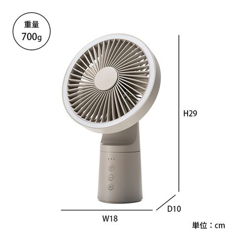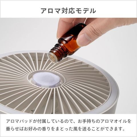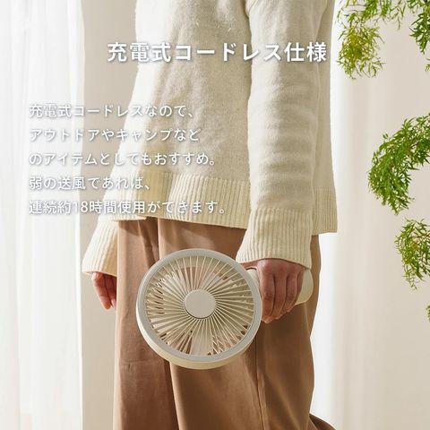 | 仕様 | 電源:USB(DC5V 2A) 消費電力:8W 風量設定:3段階 首振り:左右70°(自動)上下90°(手動) 充電時間:3.5時間 連続使用時間 強:約3時間、中:約6.5時間、弱:約18時間(送風時) 強:約2時間、中:約2.5時間、弱:約3時間(送風+LEDライト(正面+背面)+自動首振り時) 充電池:リチウムイオン充電池 3.7V 4000mAh 14.8Wh その他:両面LEDライト、アロマ対応、給電機能付 |