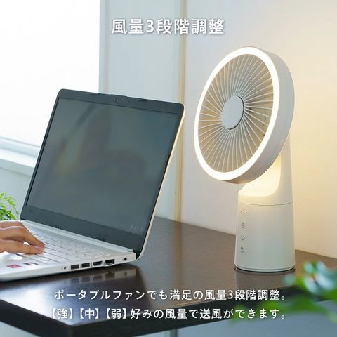 扇風機、LEDライト、モバイルバッテリー機能がこれ1台に。 家でも外でも、様々なシーンで活躍する新しい充電式ポータブルファンが登場しました。 |