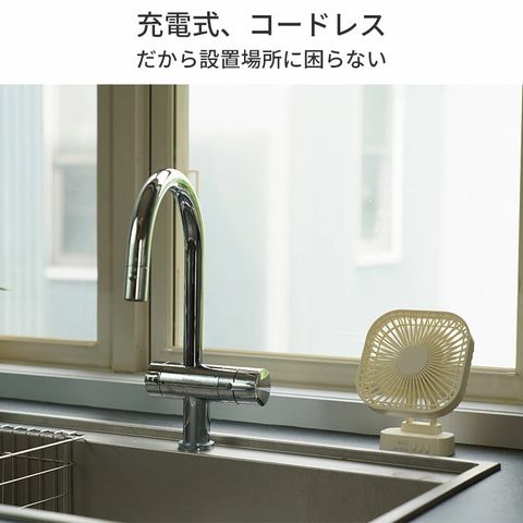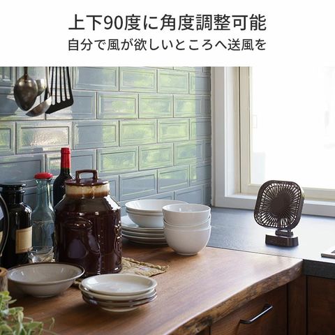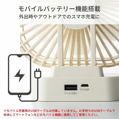 ●邪魔にならない、すっきりとした充電式コードレス 付属のマイクロUSBケーブルを使用して本体バッテリーを充電。 コードレスなので設置場所に悩まず、欲しい場所に置くことができます。 ●マグネットで貼り付ければ壁掛け式に マグネットで貼り付けができるので、壁に穴を開ける面倒な手順もなく簡単に壁掛け式として利用できます。 ※壁面の材質と取り付け場所に注意し、平らな面に設置してください。 ●欲しいところに風を送る、上下手動の首振りで風向き調整 台座を押さえてガード部分を前後することで、約90度の範囲内で首振り位置を調節することができます。 キッチンで料理中にもピンポイントでほしい角度へ送風を。 ●シーンや好みに応じて使い分けできる、風量3段階 風量は弱・中・強の3段階から好みに応じて使い分けが可能です。 仕事中などささやかな風が欲しい時は「弱」に。 キッチンなど空気がこもりがちで換気をしっかりしたい場合には「強」など、シーンに応じて調節できます。 ●消し忘れ防止に嬉しいオフタイマー機能 1時間単位で最大3時間まで設定できるオフタイマー機能搭載。 キッチンなど長時間利用しないエリアに設置している場合も、消し忘れを気にせずご利用いただけます。 ●モバイルバッテリー機能搭載、外出時のスマホ充電にも 薄型設計なので、外出時の持ち運びにも便利なサイズ感です。 モバイルバッテリーとしてもご利用いただけます。 ※モバイル充電用のUSBケーブルは付属していません。お手持ちのUSBケーブルで本体とスマートフォンなどのモバイル機器に接続してご使用ください。 |