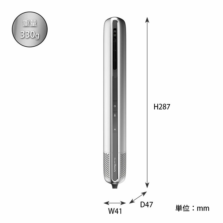 | 備考 | 【使用方法】 Step1. タオルドライ タオルドライをして表面の水分をしつかり取っていきましよう。タオルドライをすると髪を乾かす時間がぐんと短縮できます。タオルドライの際は髪の毛をはさむようにして乾かすのがポイントです。根本の部分のタオルドライも忘れずに。 Step2. 電源プラグを根本までしっかりコンセントに差し込む。 電源スイッチを「0N」にしてください。 Step3. モード選択、根本から乾かす お好みのモード設定にし、根本から風を当てていきます。髪の毛から10-15cm程度離し、髪の毛の中心から毛先の順で乾かしてきましよう。濡れた毛束がなくなるくらいまで、全体の8割ほど乾かしていきましよう。 Step4. 髪の毛を整える 前髪のスタイリングや、トップのポリューム出しもこのタイミングで行うと上手に決まります。ドライヤーも横からではなく、縦に当てることを意識することで、よりまとまりのまる髪に手櫛を通しながら髪の通り道を作ってあげるのがポイントです。 Step5. 仕上げコーティングモードに切り替え、髪の毛のクセづけをしていきます。コーティングモードで仕上げることで、キューティクルを引き締めツヤ髪に導きます。 |