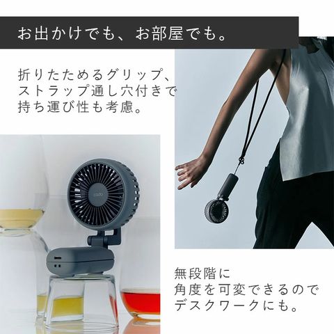 ◇すぐに涼しい冷却力。 送風面積が広く、その冷却力であっという間にどこでも涼しさを届けます。 ◇送風面積が広いので、心地よい風を顔全体に。 部分的に風を当てるのではなく、顔全体を風で覆い、いつでも心地よい涼しさを届けます。 ◇フレックス構造なので、お出かけでも、お部屋でも。 折りたためるグリップ、ストラップ通し穴付きで持ち運び性も考慮。無段階に角度を可変できるので、デスクワークにも。 ◇PD急速充電。 USB-C PD充電器に対応しています。 |