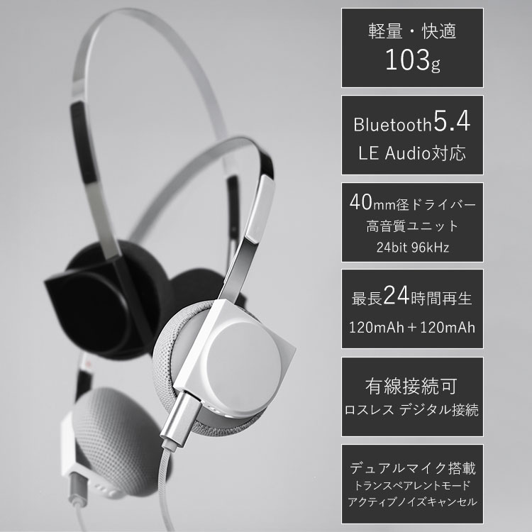 ・ニュートロな空気感に、洗練された軽量/軽快デザイン ・最新Bluetooth5.4ワイヤレスとLR独立による有線接続の両方を楽しめる ・40mmドライバーによる高音質/最大24時間再生/デュアルマイク搭載 インナーイヤフォンより開放的で、オーバーヘッドフォンより軽快な、音楽を聴くための新たな選択肢。 |