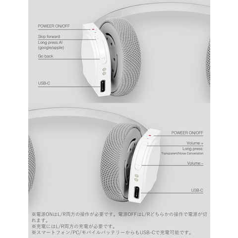 Bluetooth 5.4に対応し、40mmの高音質ドライバーを搭載。 サイズ感以上に低音から高音までしっかりとクリアで広がりのある迫力のサウンドを実現します。 付属の専用USBケーブルを使えば、充電はもちろんスマートフォンなどとUSB-C接続で有線再生も可能。 デジタル接続によりノイズレス・ロスレスオーディオを楽しめ、バッテリーが切れてもスマートフォンやPCに接続して使えます。 1回の充電で最長24時間の連続再生に対応し、周囲の音を自然に取り込めるトランスペアレントモードと、雑音をカットするノイズキャンセルモード、さらに高音質マイクと通話時のノイズキャンセル機能も搭載。 周囲の音を自然に取り込みたい時や、音楽に集中したい時など、日常の様々なシーンで快適にお使いいただけます。 |