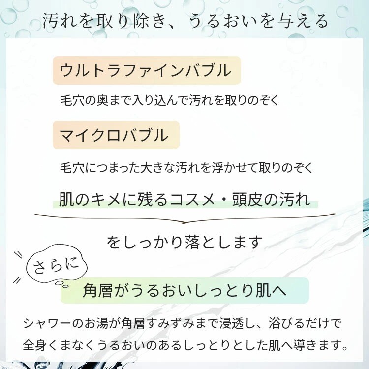 ●水を肌への刺激に変えないためにReFaが採用したのは、日本発祥の技術、ウルトラファインバブルとマイクロバブル。普段目にする通常の泡よりもずっと小さく、特異的な洗浄のメカニズムを持つ2つの泡で肌本来の美しさを引き出します。 ●ウルトラファインバブルが毛穴の奥まで入り込んで汚れを取りのぞき、マイクロバブルが毛穴につまった大きな汚れを浮かせて取りのぞきます。 ●シャワーヘッドを浴槽に入れると、滑らかな肌ざわりのシルキーバスに。肌をやわらかく包みこむので、心も身体も温まります。 |