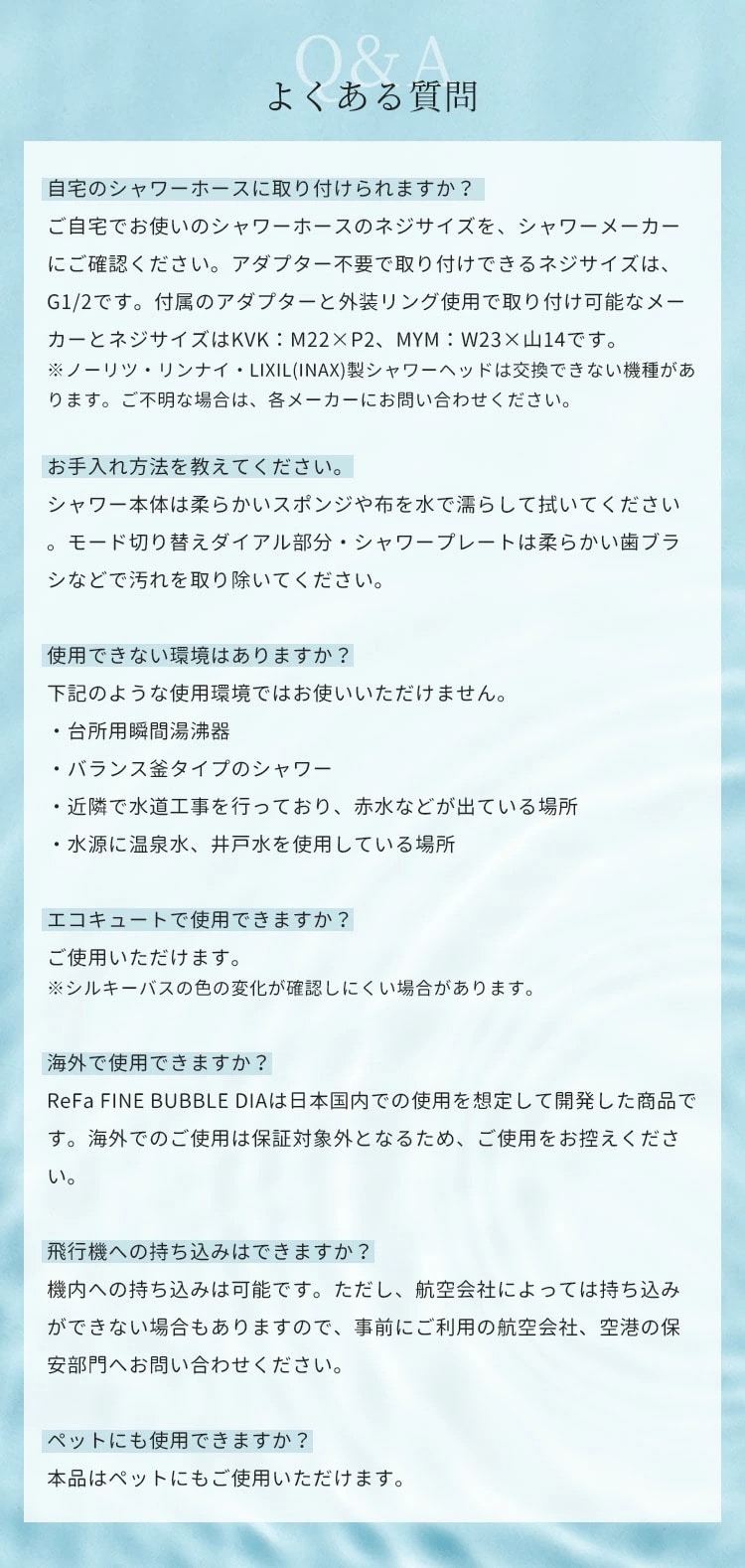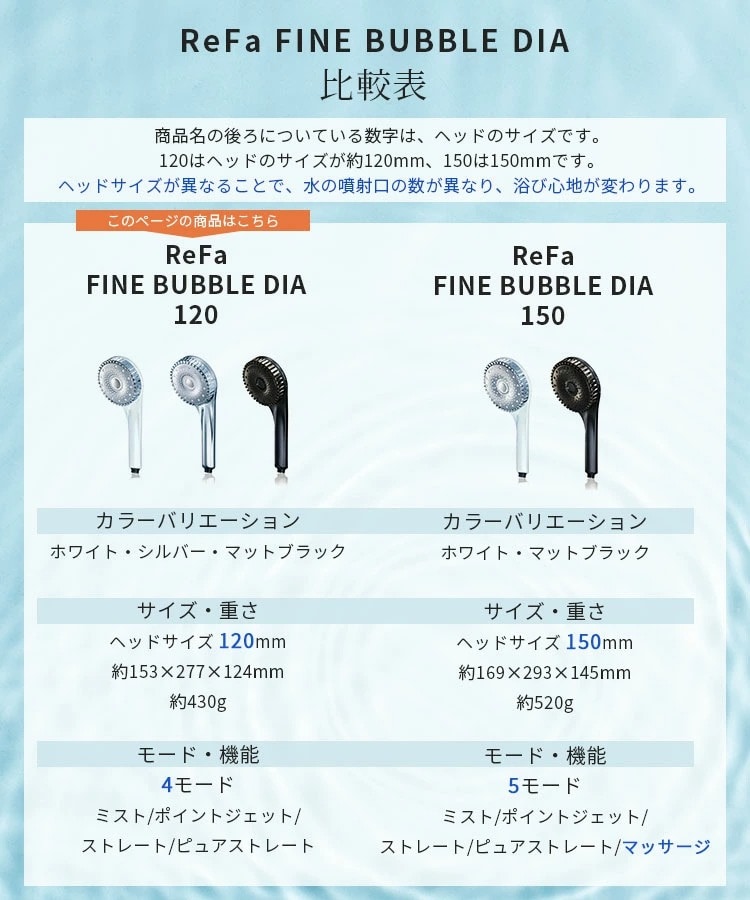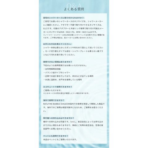 ●水を肌への刺激に変えないためにReFaが採用したのは、日本発祥の技術、ウルトラファインバブルとマイクロバブル。普段目にする通常の泡よりもずっと小さく、特異的な洗浄のメカニズムを持つ2つの泡で肌本来の美しさを引き出します。 ●ウルトラファインバブルが毛穴の奥まで入り込んで汚れを取りのぞき、マイクロバブルが毛穴につまった大きな汚れを浮かせて取りのぞきます。 ●シャワーヘッドを浴槽に入れると、滑らかな肌ざわりのシルキーバスに。肌をやわらかく包みこむので、心も身体も温まります。 |