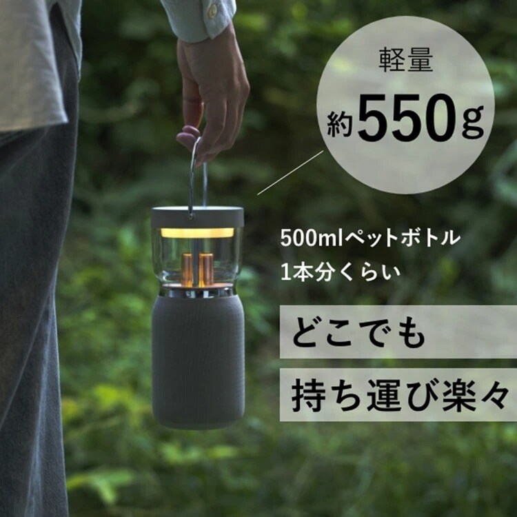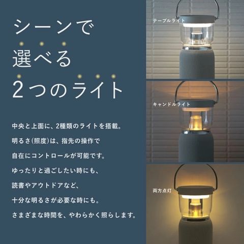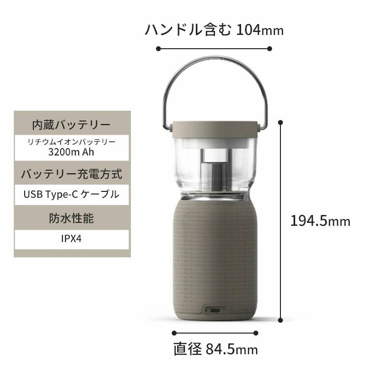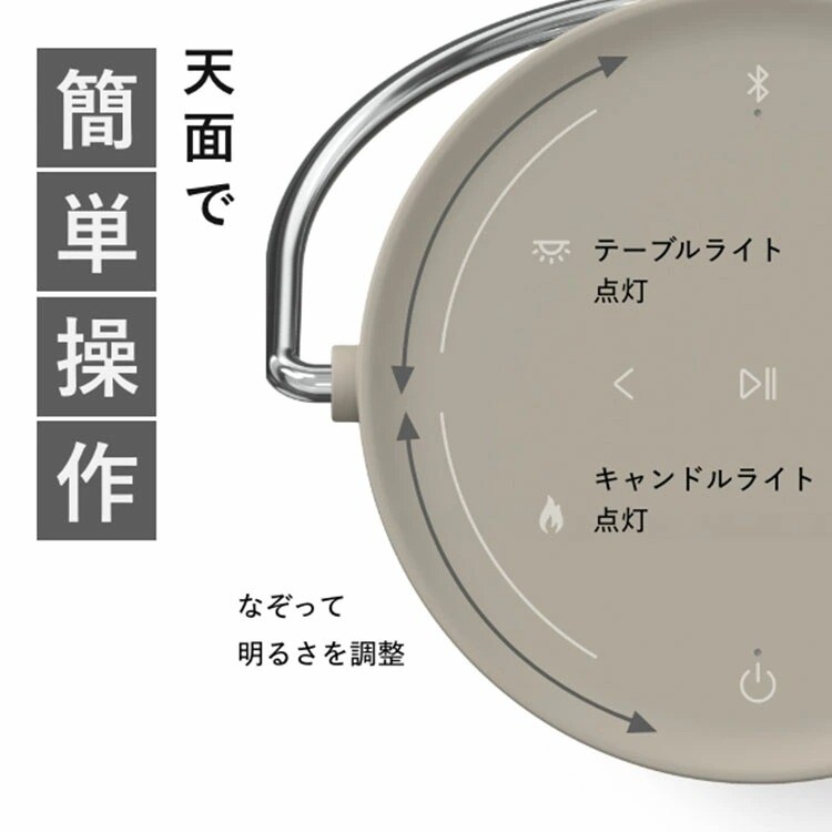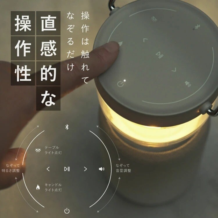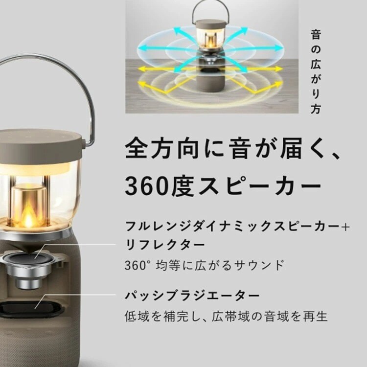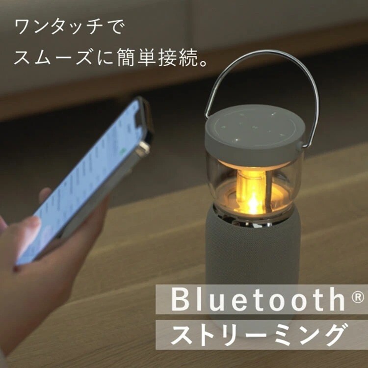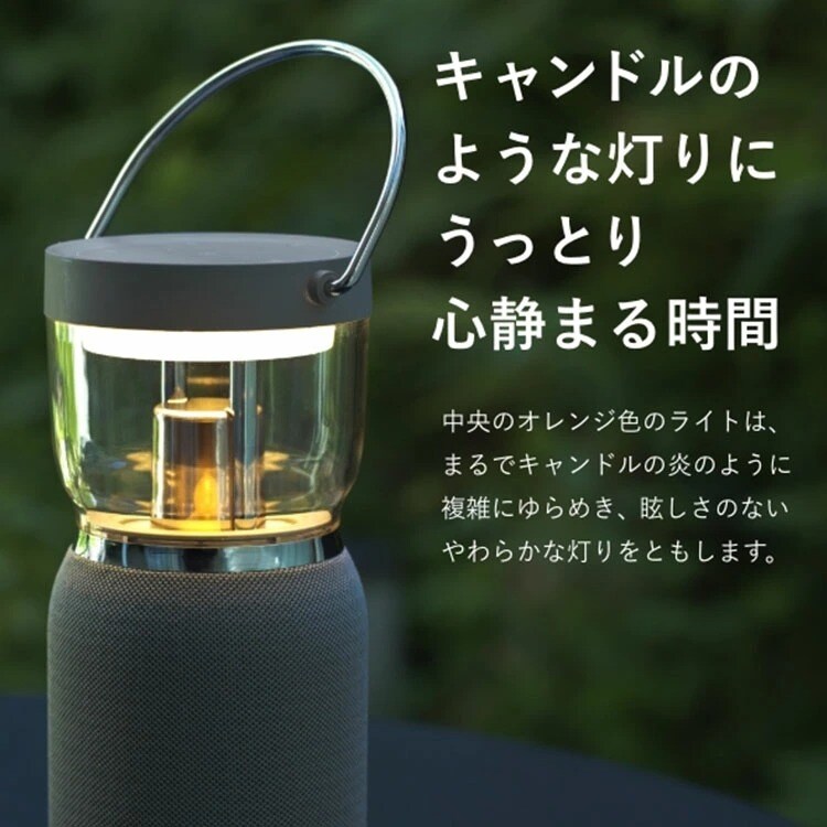 ●心を落ち着かせる、ゆらぎの灯り 中央のオレンジ色のライトは、まるで本物のキャンドルの炎のように優しく揺らめきます。 Re・De独自の「ゆらぎアルゴリズム」は、自然界の炎の不規則なリズムを忠実に再現。 この心地よい「1/f ゆらぎ」が、あなたの心に深いリラックスと充足感をもたらします。 眩しさのないやわらかな光が、読書の時間や就寝前のひとときを優しく包み込みます。 ![]() ●シーンで選べる2つのライト 本体中央のキャンドルライトと、上面のライト、2種類の光源を搭載。 指先でなぞるだけの簡単操作で、明るさ(照度)を自在に調整できます。 ゆったりと過ごしたいリラックスタイムから、読書やアウトドアなど、しっかりと明るさが必要なシーンまで、あらゆる時間を最適な光で照らします。 ![]() ![]() ●360°全方位に広がる、上質なサウンド 低音から高音まで、バランスの取れたクリアなサウンドが360度全方位に広がります。 音で空間をデザインするというコンセプトのもと、繊細で細やかな音質にこだわり抜きました。 お気に入りの音楽や自然の音を、どこにいても心地よく楽しめます。 ![]() ●空間に溶け込む、洗練されたデザイン 曲げガラスのようなゆるやかな曲線を持つ窓は、光を美しく乱反射させる二重構造設計。 陶器のようなさらりとした手触りの本体と、温かみのあるメッシュファブリックの組み合わせが、どんなインテリアにもしっくりと馴染み、上品な存在感を放ちます。 ●どこへでも連れて行ける、安心の防滴性能とコードレス設計 IPX4相当の防滴性能を備えているため、水回りやアウトドアでも安心して使用できます。 軽量なボディにバッテリーを内蔵しており、コードレスでの使用が可能。 リビングや寝室はもちろん、テラスやキャンプ、バスルームなど、お好きな場所へ自由に持ち運び、壁に吊るして使うこともできます。 ![]() ![]() ![]() ![]() ![]() ●直感的に操作できる、シンプルなインターフェース 天面のボタンに触れるだけで、電源のオン/オフができます。 本体の縁をなぞるように指を滑らせるだけで、音量や光量をスムーズに調整。 複雑な操作は一切不要で、誰でも直感的に使いこなせる、心地よさを追求した設計です。 ![]() ![]() |