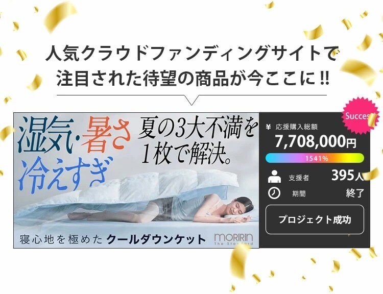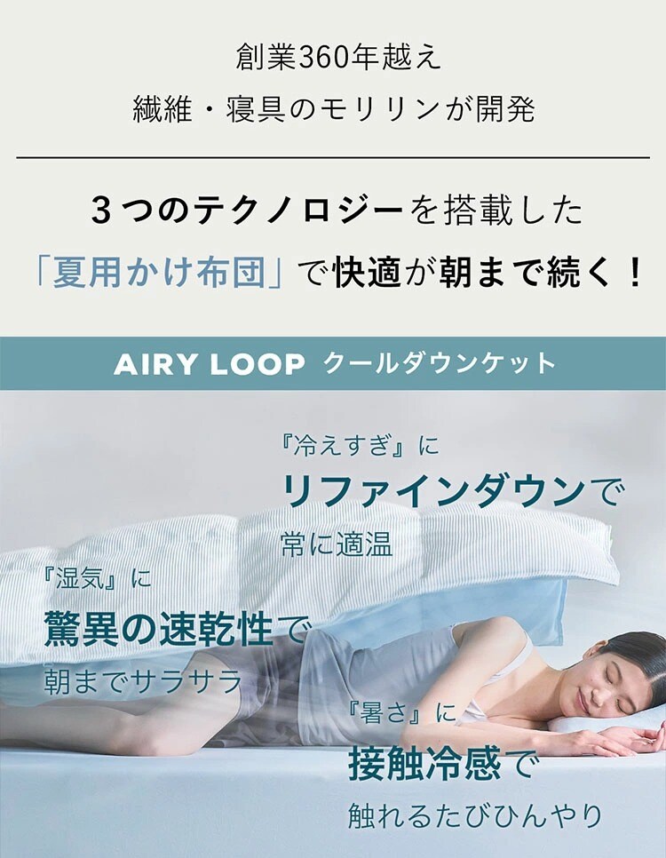 「冬用掛け布団でクラウドファンディング累計3億円突破」の実績を持つモリリンが、夏の快眠を追求し開発したのが「AIRY LOOP(エアリーループ)」掛け布団です。 夏の眠りを妨げる「暑さ」「湿気」「冷えすぎ」の3つの不満をこれ1枚で解決し、朝まで快適な睡眠環境を叶えます。 ひんやり冷たいだけではない、新発想の夏の快適さをぜひご体感ください。 |