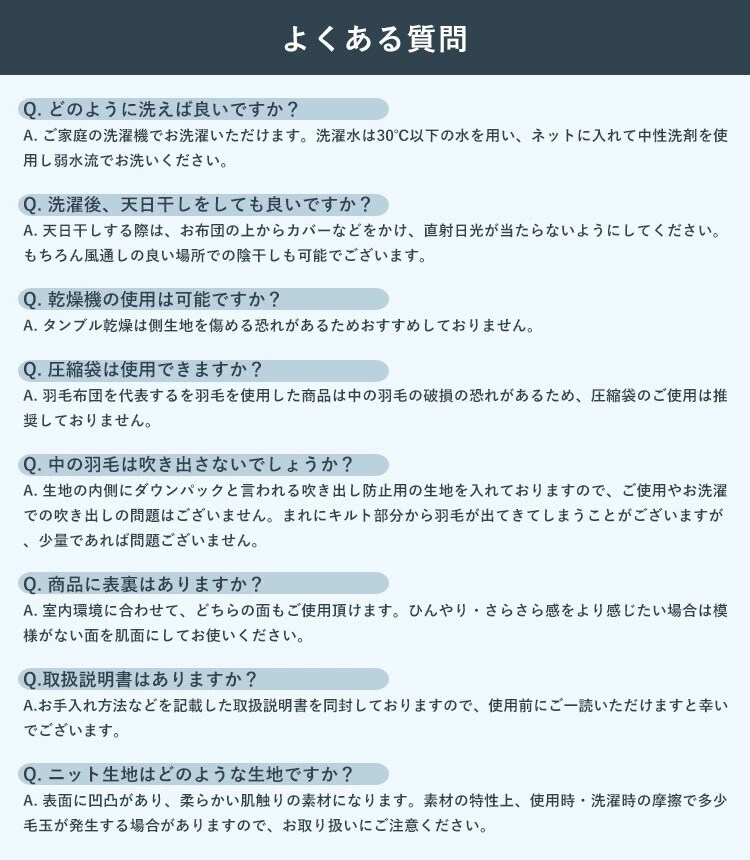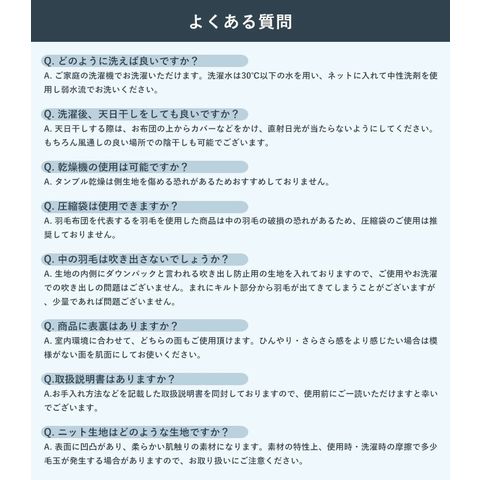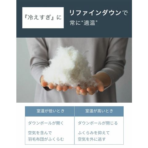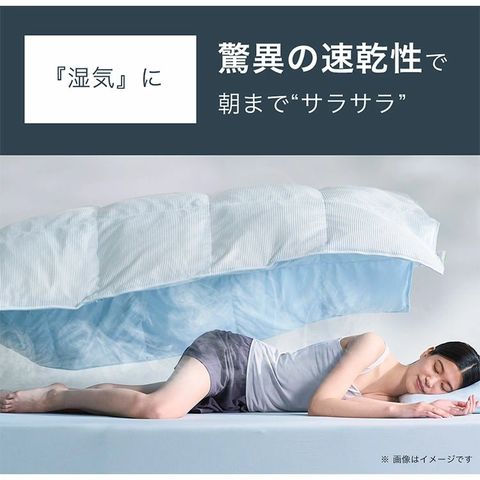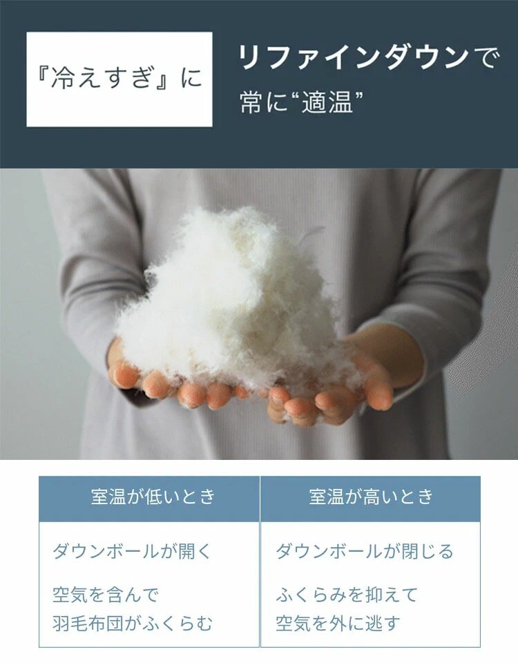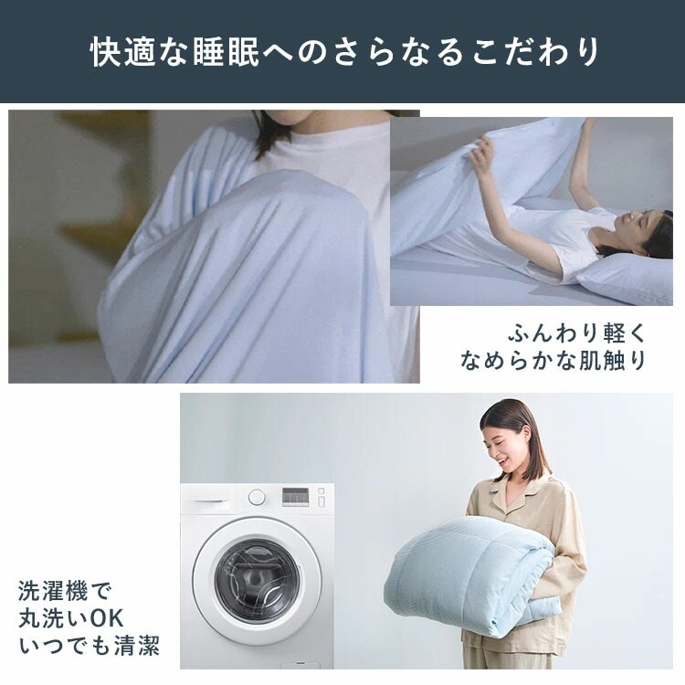 1.驚異の速乾性で朝までずっとサラサラ 体から発する水分を瞬時に乾燥させ涼しさを生み出す、糸による気化冷却を採用。 生地が汗や湿気を素早く拡散するため、肌面は常にサラサラ。高い通気性で、一晩中気持ちの良い空間が続きます。 2.触れるたびにひんやり心地よい接触冷感 触れた瞬間に熱が素早く移動し、ひんやりとした感触が広がります。 寝返りを打つたびにその冷たさを感じられ、熱帯夜でも快適に眠りにつけます。 3.リファインダウンが実現する「ちょうどいい」温度 「天然のエアコン」とも呼ばれるダウンが、布団内の温度を快適にコントロールします。 「寒すぎず、暑すぎない」常に理想的な温度で、心地よい眠りをサポート。 さらに、業界基準の4倍以上の徹底洗浄と「パワーアップ加工」で、衛生的かつふかふかに仕上げています。 |