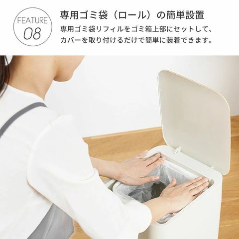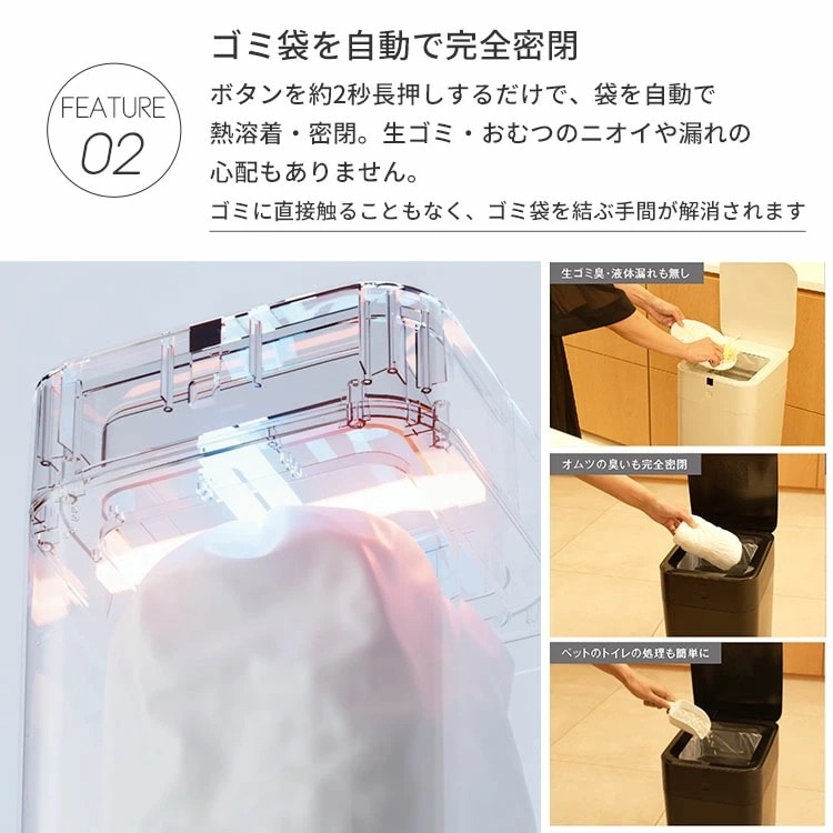 手をかざすだけでフタが自動で開閉。ゴミ箱に触れることなく捨てられるので、衛生的でスマート。料理中など両手がふさがっている時でも、足元で操作できるのでとても便利です。 ● ゴミ捨てのストレスから解放される、新体験 もうゴミ箱のフタを触ったり、ゴミ袋を結んだりする手間はありません。 ● 自動で密閉&ゴミ袋をセット ボタンを長押しするだけで、ゴミに触れずにゴミ袋を自動で熱溶着。ニオイやホコリが漏れる心配もありません。密閉されたゴミ袋を取り出すと、自動で新しいゴミ袋をセットします。 ● あふれるゴミも自動で収納・密閉 ゴミ箱からあふれてしまっても大丈夫。そのままボタンを長押しするだけで、自動でゴミを圧縮し、密閉梱包します。 ● いつでも清潔をキープ フタを閉じると、ゴミ袋内を自動でUV除菌。いつでも清潔な状態を保ちます。 ● 毎日を快適にする工夫がたくさん 日本語音声ガイド: ゴミ箱の状態を音声でお知らせ。操作方法が分かりやすく、誰でも簡単に使えます。 コードレス設計: どこでも置ける充電式(USB Type-C)なので、リビングやキッチン、寝室など、好きな場所で使えます。 専用ゴミ袋(ロール): ロール状の専用ゴミ袋をセットするだけ。次のゴミ袋をセットする手間が省けます。 |