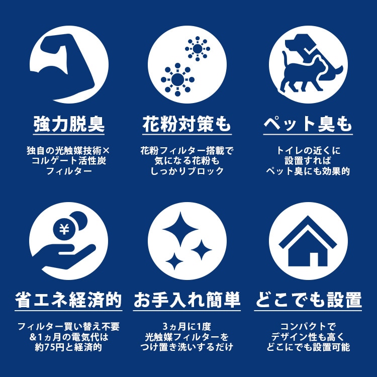 取り込んだニオイ、ウイルス・菌を光触媒で強力除去!もちろん花粉フィルターも搭載。使い勝手も性能もちょうどいい、お手頃な除菌脱臭機です。 ●強力脱臭 独自の光触媒技術×コルゲート活性炭フィルターで最大8畳の空間をまるごと脱臭! ●ペットにも安全 光触媒はオゾンや塩素などの有害物質を出さないのでペットにも安心して使用いただけます。 ●省エネ・経済的 フィルタ ー の買い替えは不要!1か月の電気代はたったの75円! ●どこでも設置可能 付属のスタンド・フックの活用であらゆる場所で使用可能に。 ●お手入れ簡単 3カ月に一度、光触媒フィルターをつけ置き洗いするだけ!脱臭性能が復活します。 ●コンパクト設計 手のひらに乗るほどコンパクト。A5ノートサイズで、高さは500ペットボトルより小さいです。 |