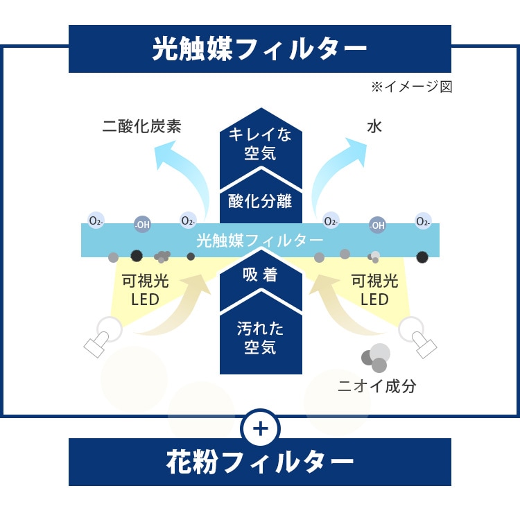 光触媒は酸化チタン(Ti02)という顔料が原材料であり、錠剤やホワイトチョコレート、化粧品やドーム球場の屋根など、実は身近なものに含まれています。カルテックはこの酸化チタンを特殊な配合で“秘伝のタレ”を作り、洗っても剥がれない(繰り返し使え、長寿命)光の当たる表面積を最大限にキープいう特徴のフィルターで製品を開発しています。 フィルターに光を照射すると、強力な酸化力が発生するため、これを利用してニオイやウイルス、菌を除去します。 |