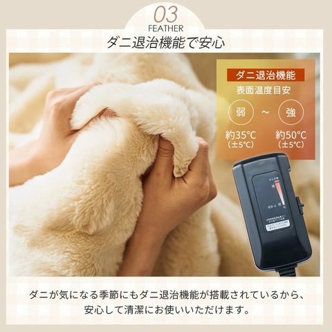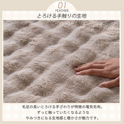 【極上の手ざわり&幅広い使い方で快適】 ● とろける手ざわりの生地 毛足が長く、ずっと触れていたくなるようなやみつきの生地感と暖かさが魅力。極上の肌触りを実現しました。 ● 掛敷両用の電気毛布 ひざ掛け、掛け毛布、敷き毛布としてマルチに活躍。ソファーやベッドなど、幅広いシーンで使えます。 【安心をプラス。いつでも清潔・安全設計】 ● ダニ退治機能で安心 気になるダニも退治できる機能付き。清潔にお使いいただけます。 ● 消し忘れ防止機能付き 電源を入れて8時間後に自動で電源がOFFになる機能付き。安心かつ経済的です。 ● 本体丸洗いOKで清潔に 本体は洗濯機で丸洗いが可能。いつでも気持ちよく、清潔にお使いいただけます。 |