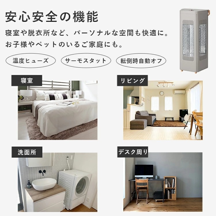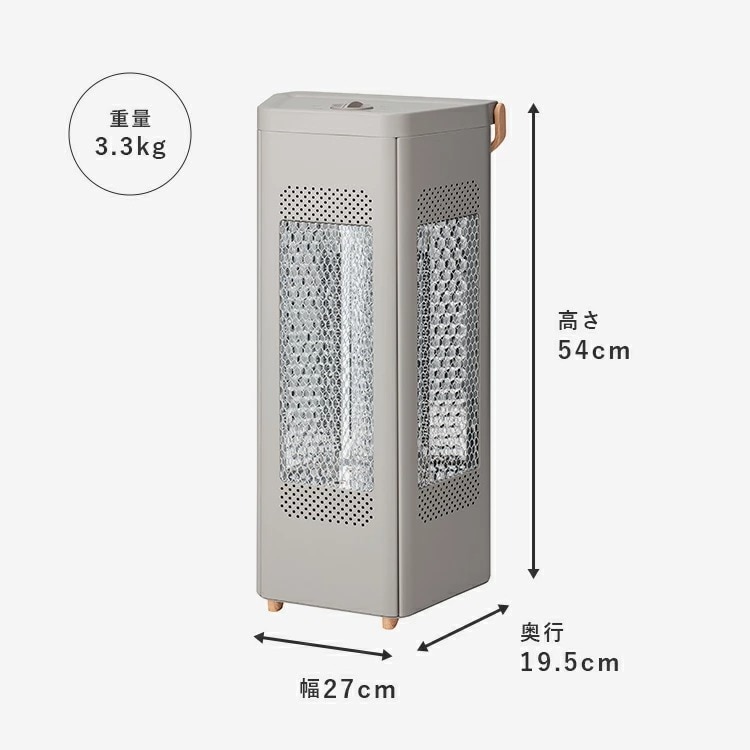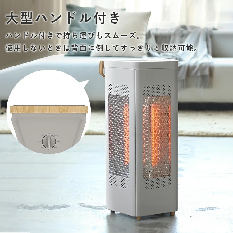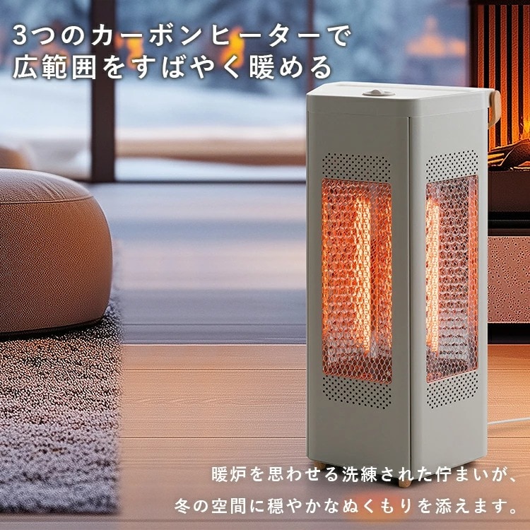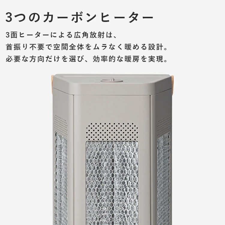 ●3つのカーボンヒーター 3面ヒーターによる広角放射は、首振り不要で空間全体をやさしく包み込み、ムラなく暖める設計。必要な方向だけを選べる省エネ設計で、効率的な暖房を実現。 ●ダイヤル式スイッチ ダイヤル式スイッチで直感的にモード操作が可能です。 ●大型ハンドル付き 大型ハンドル付きで持ち運びもスムーズ。 使用しないときは背面に倒してすっきりと収納することができます。 ●安心安全の機能 転倒時自動オフ機能と温度ヒューズ、サーモスタットを備えた安心設計。寝室やデスク周り、脱衣所など、パーソナルな空間でも快適に使えます。 |