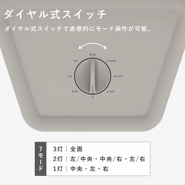 | 仕様 | ■電源:AC100V 50/60Hz ■消費電力:3灯/1200W、2灯/800W、1灯/400W ■モード:7モード(3灯/1モード、2灯/3モード、1灯/3モード) ■安全装置:温度ヒューズ、サーモスタット、転倒時自動オフスイッチ ■コード長:1.5m ■1時間あたりの電気代:約37.2円(3灯/1200W連続運転時) |