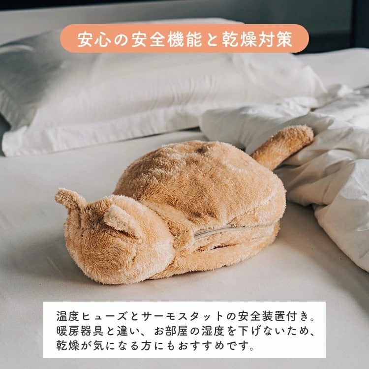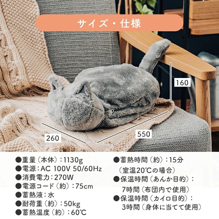 ・15分蓄熱で朝までポカポカ:約15分アダプターに繋ぐだけで、蓄熱が完了。布団内では約7時間、体に当てて約3時間、温かさが持続します。 ・繰り返し使えるエコ設計:お湯の入れ替えが不要な電気蓄熱式だから、手間なく繰り返し使え、環境にもお財布にも優しい省エネ設計です。 ・コードレスでどこでも大活躍:蓄熱後はコードを外せるため、リビング、寝室、アウトドアなど場所を選ばず使用できます。 ・猫好きに贈る最高の癒やし:まるで猫が乗っているような自然な重みと温かさで、心も体もリラックス。ペットが飼えない方への贈り物にも最適です。 ・安心の安全機能と乾燥対策:温度ヒューズとサーモスタットの安全装置付き。暖房器具と違い、お部屋の湿度を下げないため、乾燥が気になる方にもおすすめです。 |