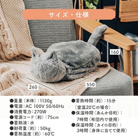 | 仕様 | ●電源:AC 100V 50/60Hz ●消費電力:270W ●電源コード(約):75cm ●蓄熱液:水 ●蓄熱時間(約):15分(室温20℃の場合) ●保温時間(あんか目的):7時間(布団内で使用) ●保温時間(カイロ目的):3時間(身体に当てて使用) ●蓄熱温度(約):60℃ ●耐荷重(約):50kg ●安全装置:温度ヒューズ、サーモスタット |