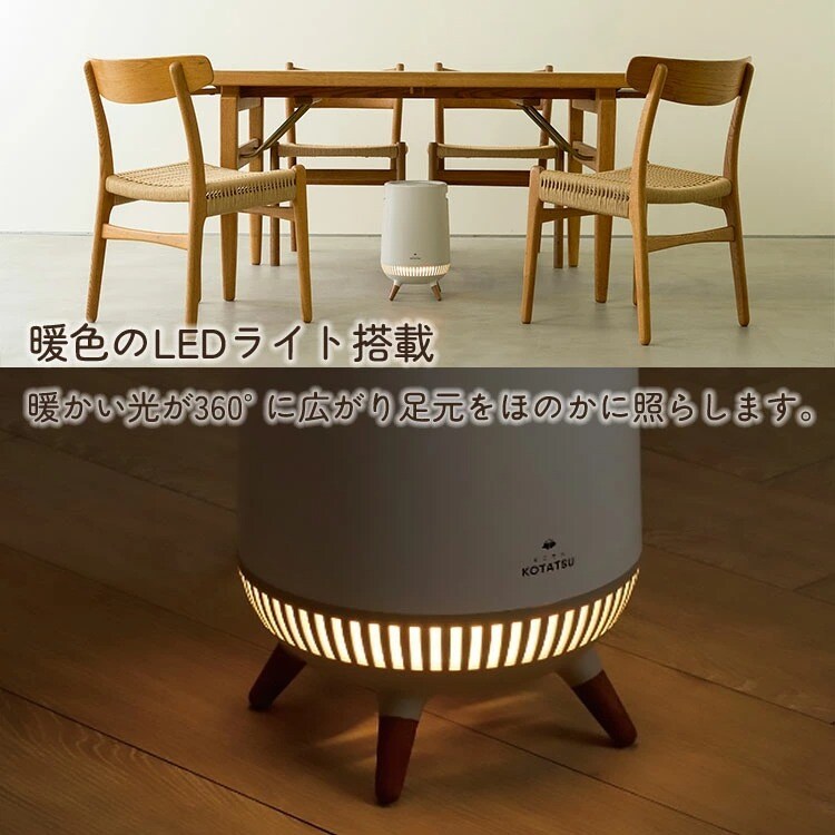 ● 暖色LEDライト搭載で足元を優しく照らす 本体下部の吹出口には、暖色系のLEDライトを搭載。暖かい光が360°に広がり、足元をほのかに照らします。 ● 薄型リモコン付属で操作ラクラク テーブルの下を覗き込む必要はありません。付属の薄型リモコンで、手元で簡単に操作が可能です。 ● 小さなお子様やペットにも安心の安全設計 ご家庭での使用を考え、万が一に備えた安全機能が充実しています。 ・チャイルドロック ・6時間自動オフ ・転倒時自動オフ |