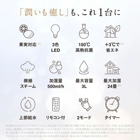 01●広い空間もしっかり加湿 加湿能力は500ml/h、最大使用8時間。通常モードとおやすみモードを搭載し、パワフルな加湿力で寝ている間も、くつろぐ時間も部屋中を快適に保ちます。 また、ふんわりとした微細な蒸気が行き渡り、床や家具を濡らすことなく心地よい加湿を叶えます。 02●スチーム式で衛生的◎ ヒーターでタンクの水を高温加熱(およそ100℃)することで、雑菌やぬめり、においの発生を抑えて清潔に保ちやすい設計です。蒸気は熱すぎない中温スチームで快適な空間づくりをサポートします。 高級電気ケトルや哺乳瓶にも使われる高ホウケイ酸ガラスを採用。熱に強く、におい移りもしにくく清潔な素材で、透明感があり水の美しさまで楽しめます。 03●+3℃であったか快適 同じ室温でも湿度が低いと寒く、湿度が高いと暖かく感じます。スチーム加湿器は100℃で沸騰した蒸気を送り出すので、超音波式加湿器に比べて暖かさを感じます。使用することで暖かい蒸気が広がり、室温が約3℃上がるため、暖房費を節約でき省エネにもつながります。 ※使用環境により温度が大幅に前後する場合がございます。 04●暮らし彩る「光」と「香り」 柔らかな光が部屋を包み込み、心地よい空気と潤いでリラックスできる空間に。ふんわりと光るLEDライトは3種類(白/黄色/青)。お部屋や気分に合わせて変更できます。 また、果実を入れることで、見た目と香りの両方をお楽しみいただけます。 05●さらにうれしい充実機能 ・操作しやすいタッチパネル式+リモコン操作 ・上部給水式 ・給水タイミングがわかる ・タイマー3段階(2/4/8時間) ・メモリー機能搭載 ・静音35.6dB ・転倒時加熱停止機能 ・水切れ自動停止 ・軽量設計約2.5kg ・収納もらくらくなコンパクトサイズ |
