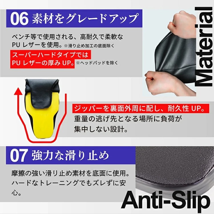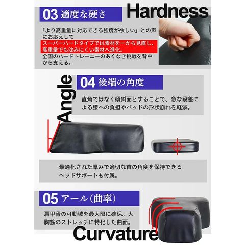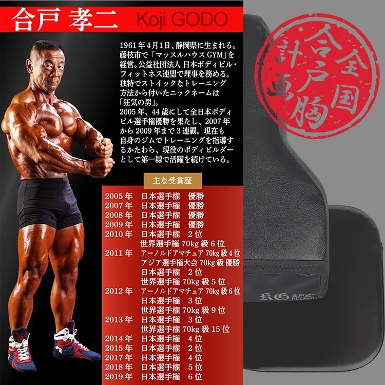 【新「スーパーハード」仕様の特徴】 ・高重量時でも沈みにくくなった硬質素材を採用し、負荷をよりダイレクトに胸筋へ伝達。 ・通常版に比べ、クッション性は抑えめだが、その分ストレッチ耐性と耐久性を強化。 ・より背中に優しくエッジを取り除く処理を追加。 “狂気の男”ボディビルダー合戸孝二考案 「合戸式 大胸筋肥大ペックパッド」で狂気の筋肥大を起こせ! 「全国大胸筋肥大計画」始動! 合戸式大胸筋肥大パッドは合戸 孝二氏の全面協力の元、専門機関を通じて現物の精密な測定と分析を行い膨大な試行錯誤を繰り返した結果、価格帯を大幅に抑えながらも手作りの一点物と同等の性能を持つ完全再現に成功したパッドです。 胸トレの刺激と効率を大幅に向上させ、このパッドを使うトレーニーの大胸筋が狂気的に発達する未来を望んでいます。 【長年のトレーニング&改善で積み重ねられてきた究極の形】 ●大胸筋肥大に理想的なフォームを保持するためのくびれがあるサドル型。 ●トレーニーの身体+ウエイト荷重を吸収し快適な使用感を実現する十分な厚み。 ●一般的なトレーニング強度はもちろん、高重量を扱う上級者にも対応した、硬すぎず柔らかすぎない適度な硬さ。 ●傾斜面にすることで急な段差による腰の負担やパッドの形状崩れを軽減。 ●大胸筋のストレッチに特化した曲面。 ●高頻度・高負荷での激しいトレーニングにも耐えるこだわりの素材。 ●強力な滑り止めでハードなトレーニングでもズレずに安心。 |